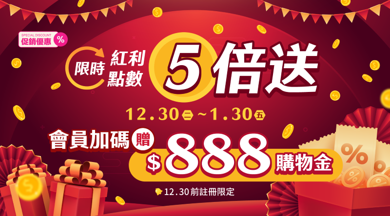 活動辦法:凡於2025/12/30前註冊官網會員,即可獲得迎新年好禮「$888購物金」