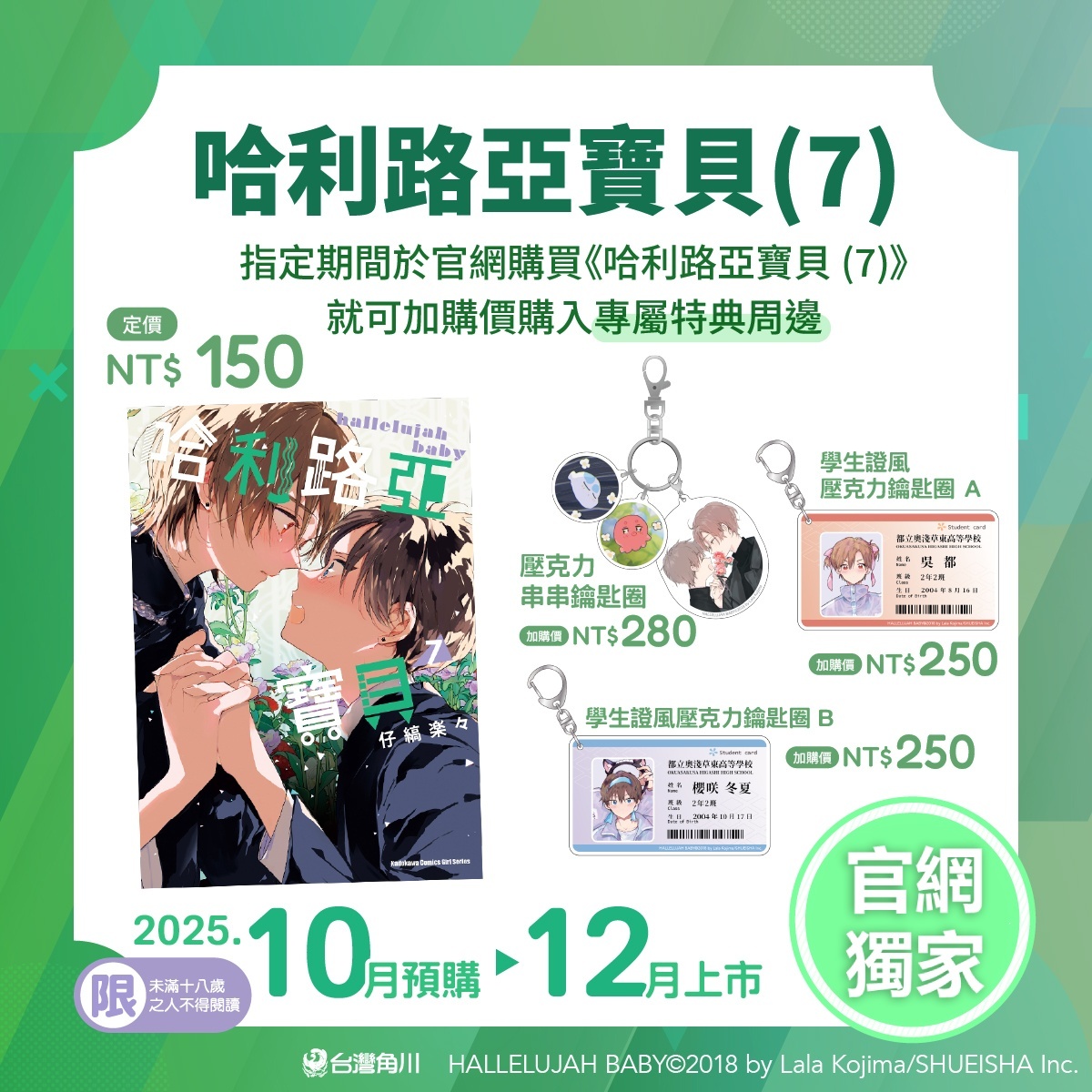 於台灣角川官網預購、購買「哈利路亞寶貝(7)」,方可以加購價購入。
