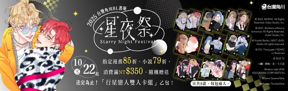 星夜降臨,一起收藏專屬戀人故事共度浪漫秋夜!台灣角川BL書系活動「2025星夜祭」即將於10/22起全台開跑!凡於指定通路購買台灣角川出版的指定BL漫畫、小說,單筆消費滿NT$350,即可獲得限量「行星戀人雙人卡組」乙包。卡片以星夜與行星元素展現CP間的羈絆與浪漫氛圍,共推出9款,以人氣 BL 作品角色為主題,款式隨機贈送,數量有限,送完為止。詳細辦法及活動參展店家名單請至「2025星夜祭」活動官網查詢:https://event.kadokawa.com.tw/2025/starry-night-festival。