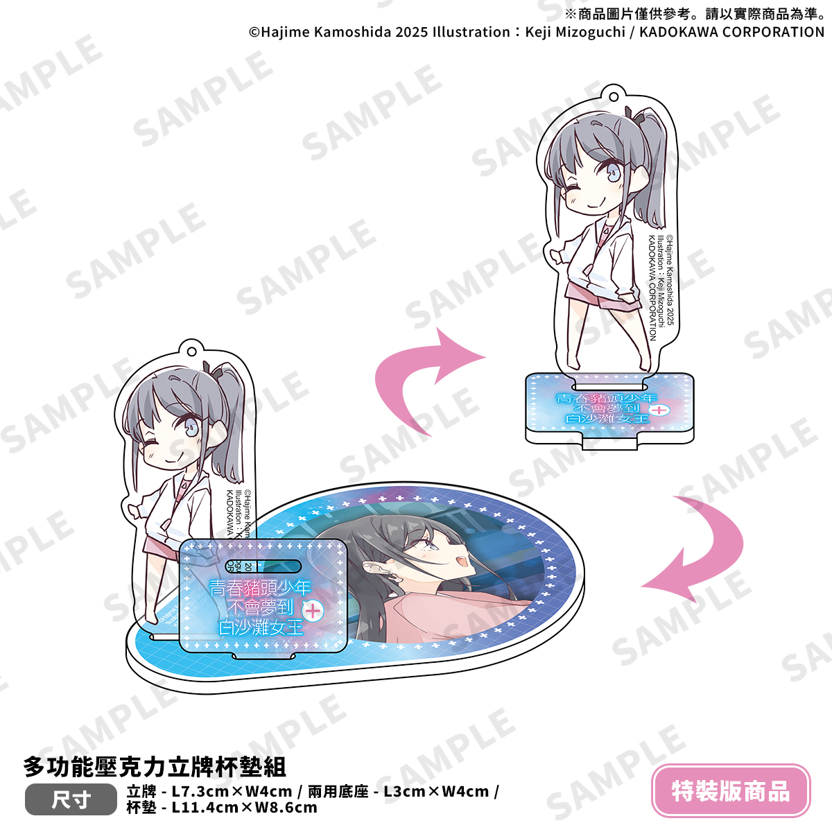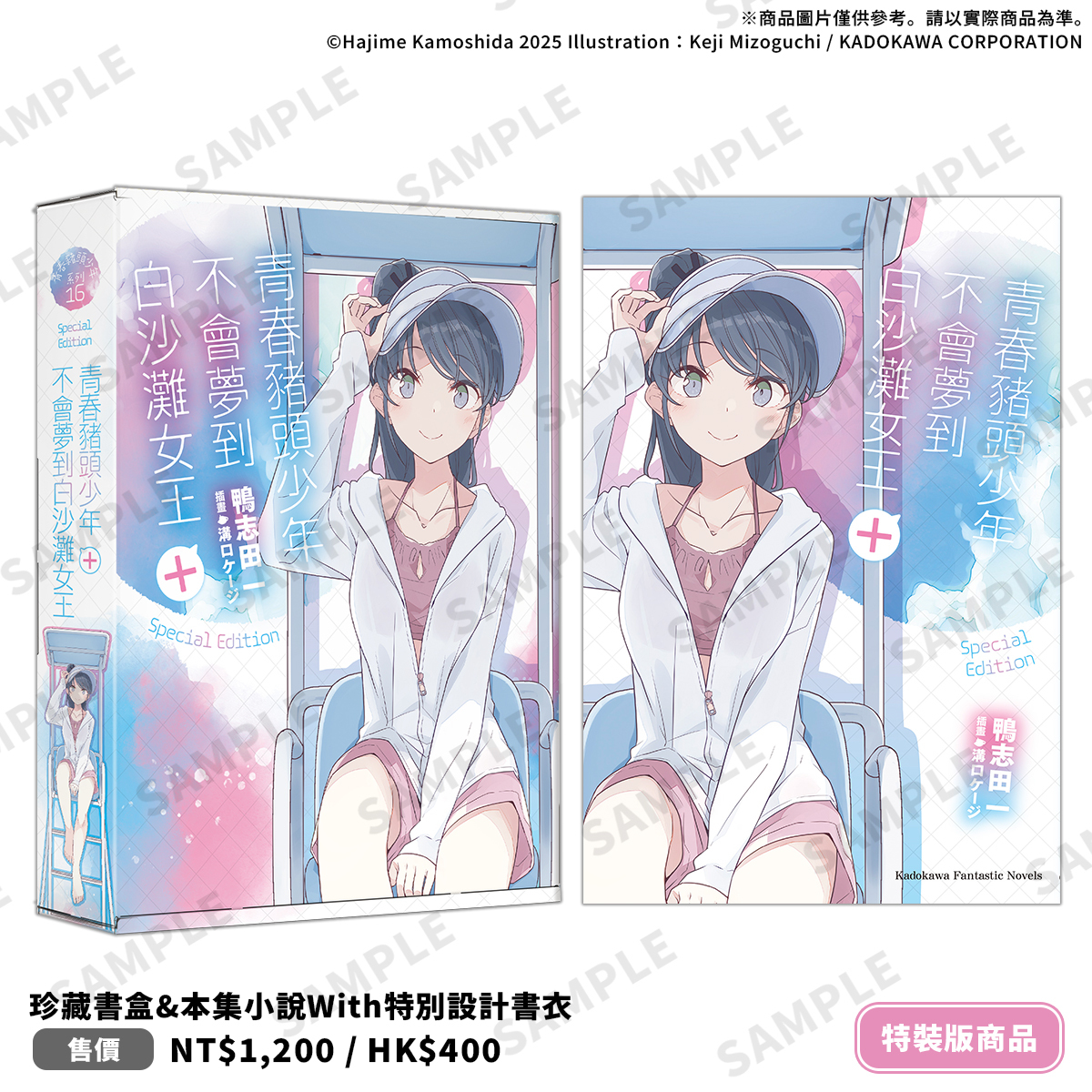 《青春豬頭少年不會夢到白沙灘女王+》特裝版,以麻衣身著泳裝坐在救生椅上的插圖作為封面設計的「珍藏書盒」,收錄特典:「本集小說With特別設計書衣」、麻衣同款「白沙灘女王應援巾」、結合角色立牌與杯墊功能的「多功能壓克力立牌杯墊組」,以及展現夏日光影魅力的「炫彩壓克力色紙」。特裝版自即日起開放事前限期預購至11/26(三) 23:59止,於台灣角川官網完成預購加贈官網滿額優惠券100元(使用期限為60天)。