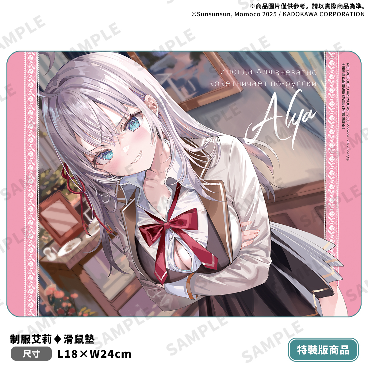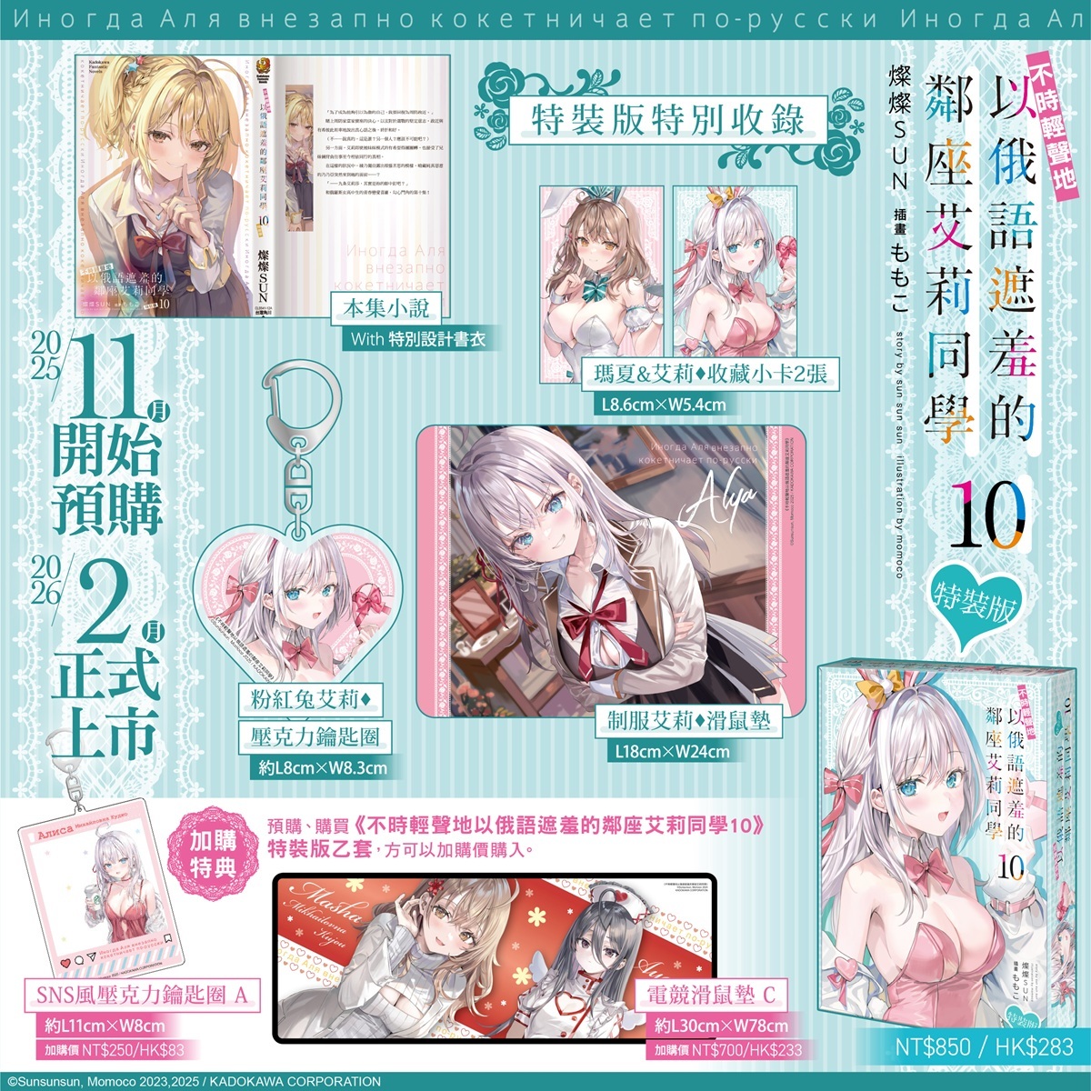 本次《不時輕聲地以俄語遮羞的鄰座艾莉同學 (10)》推出限定版與特裝版兩種版本,分別收錄不同主題角色精品,並皆附「本集小說with特別設計書衣」。限定版以溫柔氛圍與角色互動為主軸,收錄艾莉身著柔色睡衣、露出靦腆笑容的「布掛畫(附組裝桿)」、Q版護士綾乃的「皮革吊飾」以及性感造型的護士綾乃搭配醫師瑪夏的「收藏小卡2張」,從校園到日常、從睡衣到呵護,讓粉絲一次收藏角色最動人的模樣。特裝版則以此為延伸,收錄艾莉以制服造型微笑挑釁的姿態,重現她專屬的傲嬌與撩人氣息的「滑鼠墊」、粉紅兔艾莉的心型「壓克力鑰匙圈」以及與艾莉同款設計的瑪夏兔女郎造型的「收藏小卡2張」,甜美與俏皮兼具,讓你一次全擁有。限定版將於台灣角川會場與官網獨家販售;特裝版自即日起開放事前限期預購至12/9(二)23:59,於台灣角川官網完成預購再加贈滿額優惠券100元。