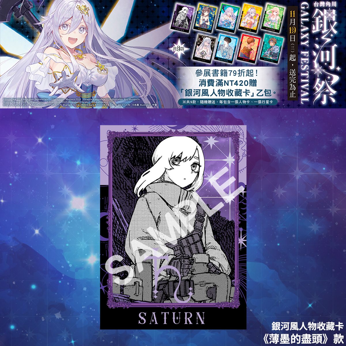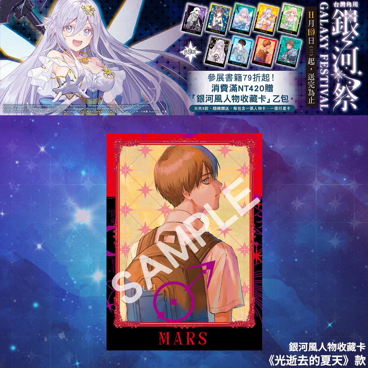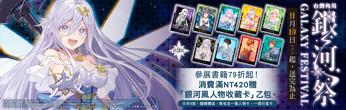 凡於台灣角川官網及指定通路購買台灣角川出版之漫畫、輕小說、畫冊、華人原創、輕.文學、精品,單筆消費滿420元,即可獲得散發星河之光的「銀河風人物收藏卡」乙包。※共9款,隨機贈送,送完為止。