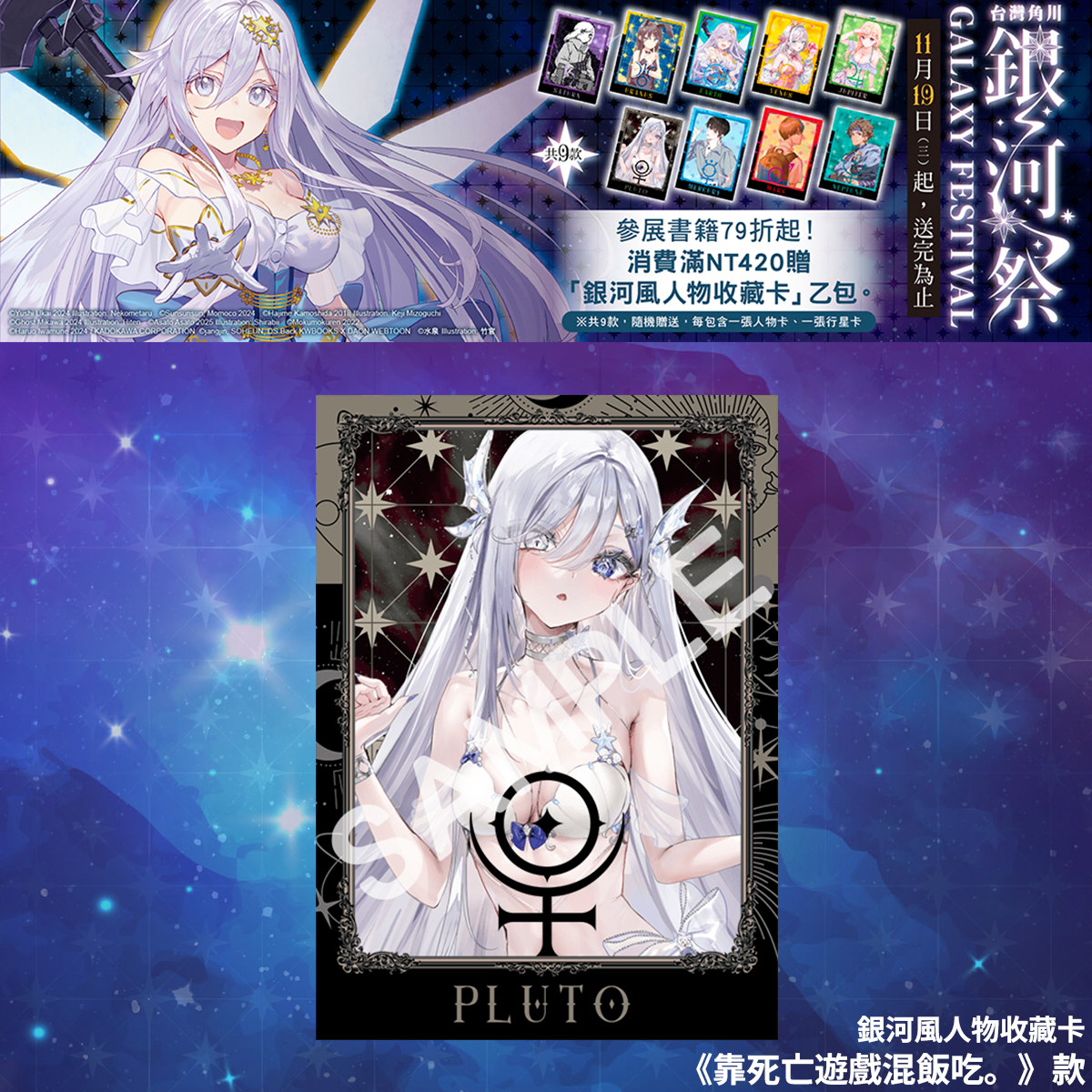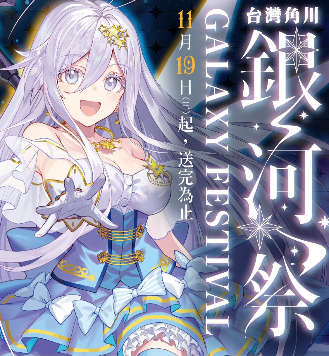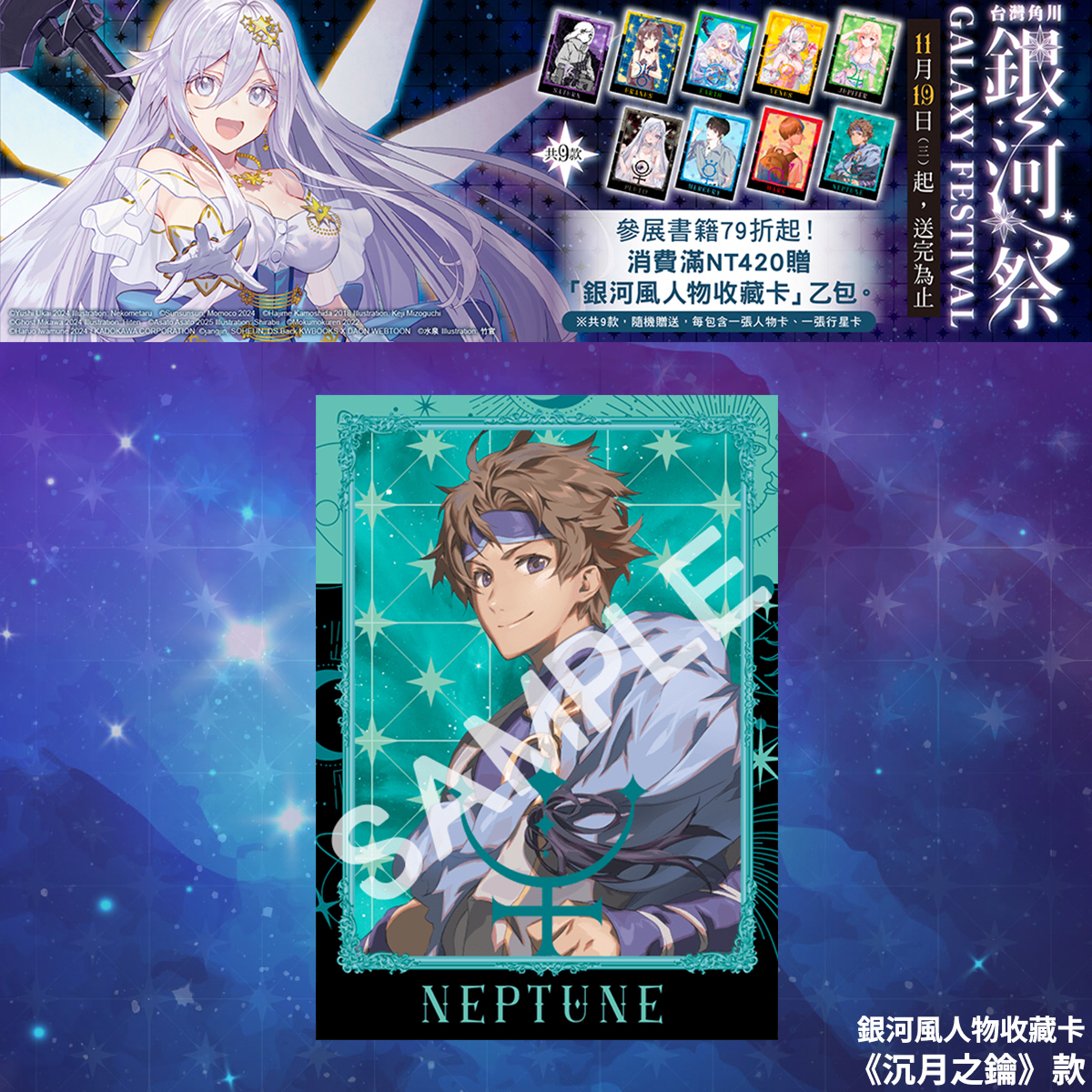 凡於台灣角川官網及指定通路購買台灣角川出版之漫畫、輕小說、畫冊、華人原創、輕.文學、精品,單筆消費滿420元,即可獲得散發星河之光的「銀河風人物收藏卡」乙包。※共9款,隨機贈送,送完為止。