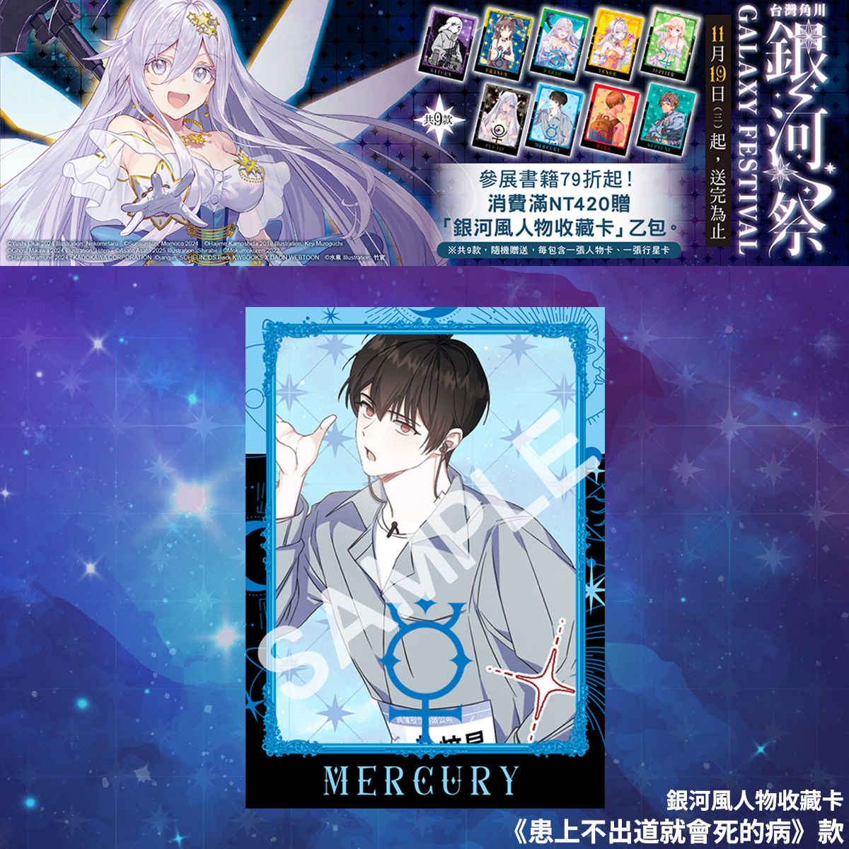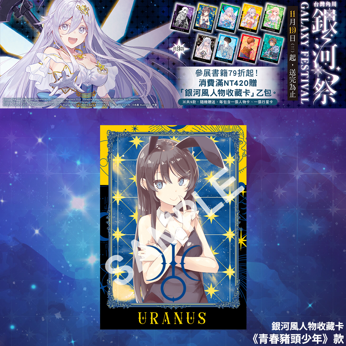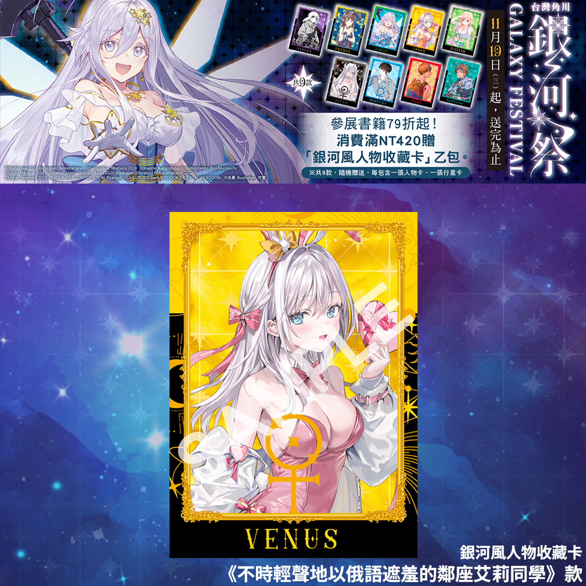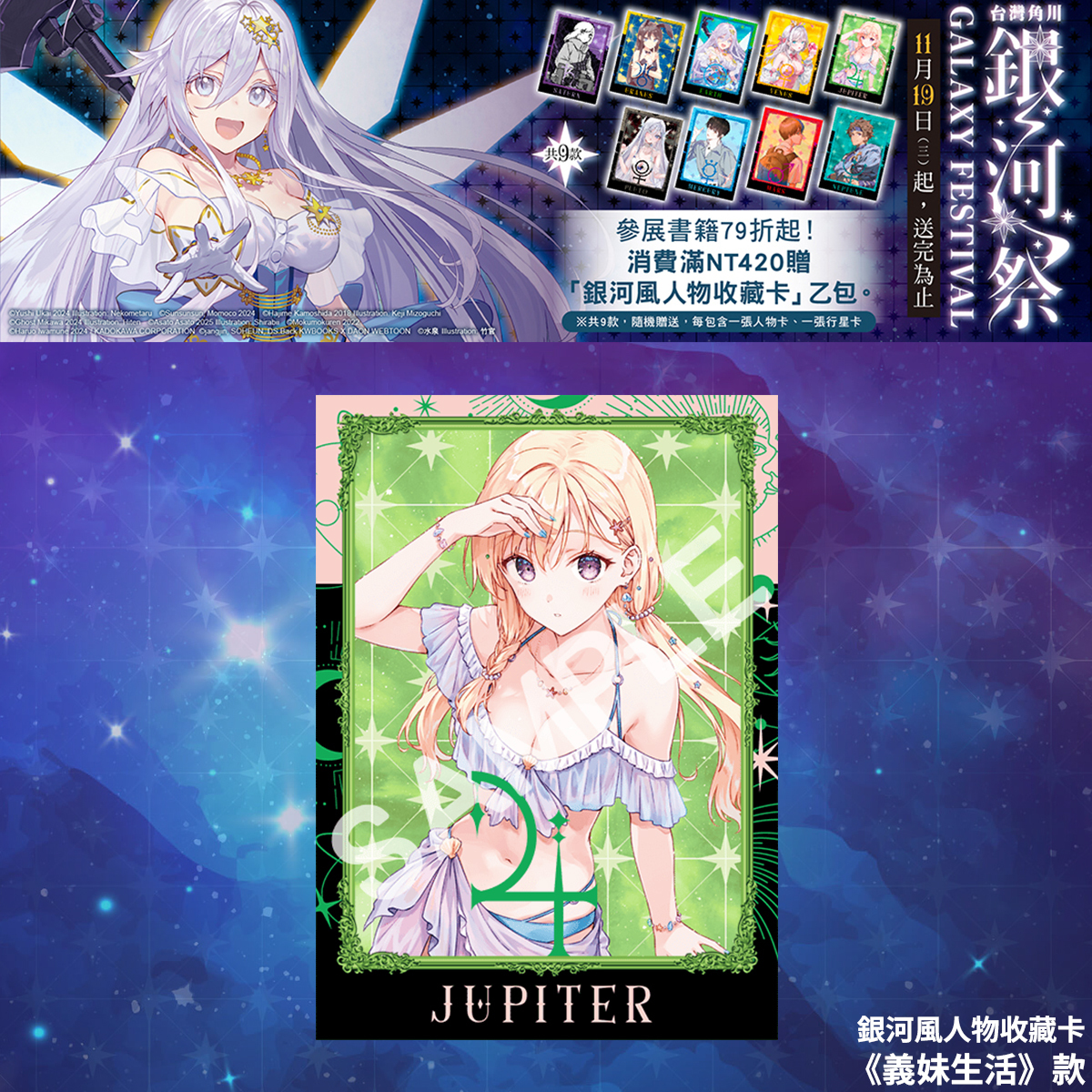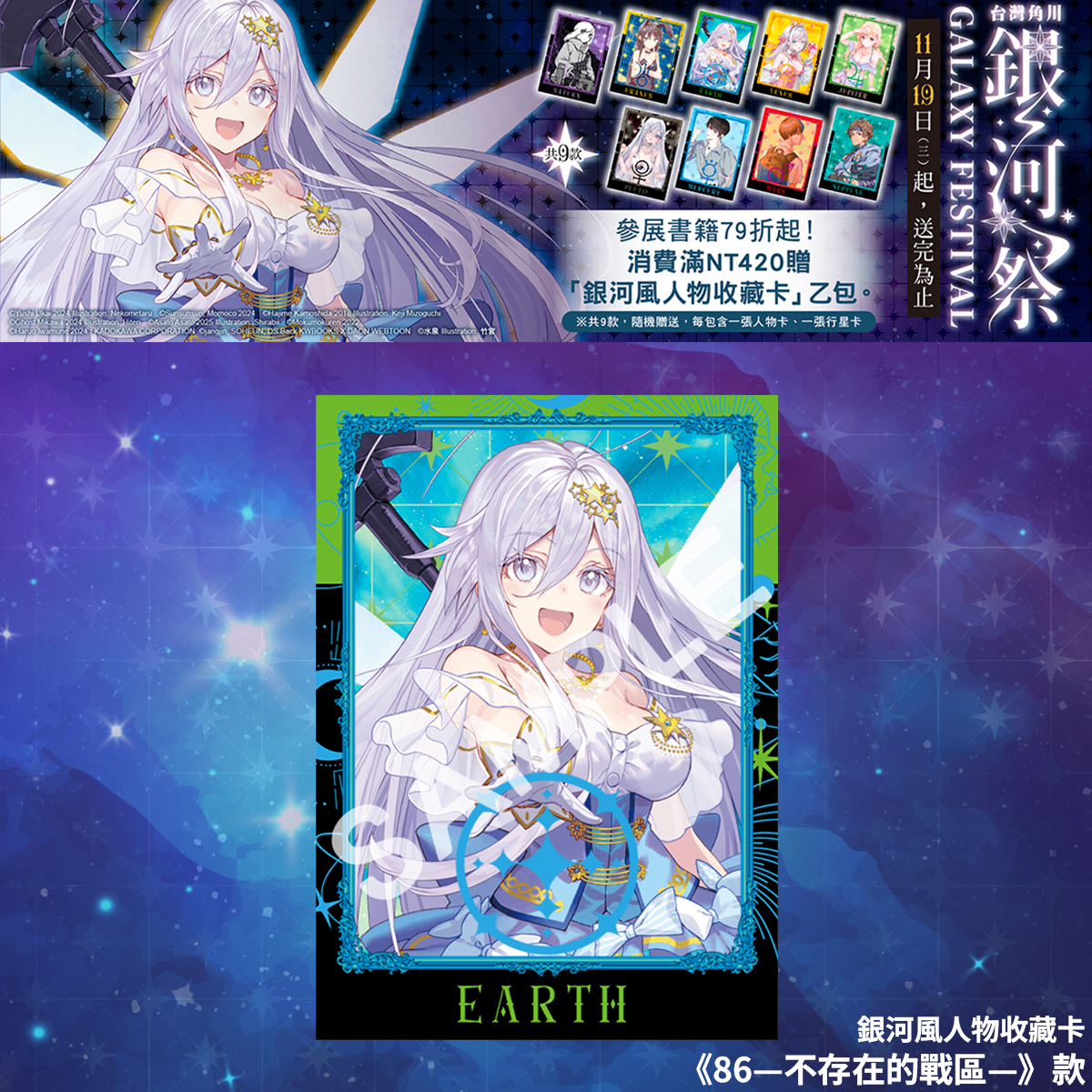 「2025銀河祭」活動限定推出珍藏特典「銀河風人物收藏卡」以九星為主題設計,每包內含「人物卡」與「行星卡」各一張,透過透明層疊與星空光澤加工,營造宛如置身宇宙的夢幻視覺效果,收藏越多可搭配的組合也就越多。本次共推出九款──《86—不存在的戰區—》款、《義妹生活》款、《靠死亡遊戲混飯吃。》款、《不時輕聲地以俄語遮羞的鄰座艾莉同學》款、《青春豬頭少年》款、《沉月之鑰》款、《光逝去的夏天》款、《薄墨的盡頭》款、《患上不出道就會死的病》款,自11/19(三)起於指定通路書店消費滿額NT$420即可獲得乙包!
