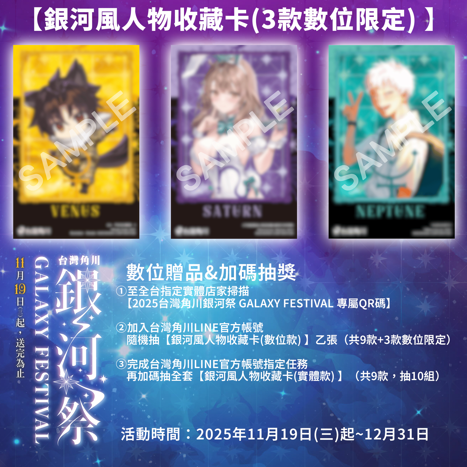 以「銀河」為主題、結合實體與數位收藏體驗的台灣角川全新全書系活動「2025銀河祭」將於11月19日盛大登場!活動期間,凡於台灣角川官網及指定通路購買台灣角川出版之漫畫、輕小說、畫冊、華人原創、輕.文學、精品,單筆消費滿420元,即可獲得散發星河之光的「銀河風人物收藏卡」乙包。本次共推出9款樣式,採隨機贈送,不可挑選,數量有限、送完為止!詳細辦法及活動參展店家名單請至「2025銀河祭」活動官網查詢:https://kadokawa.io/oO0he。