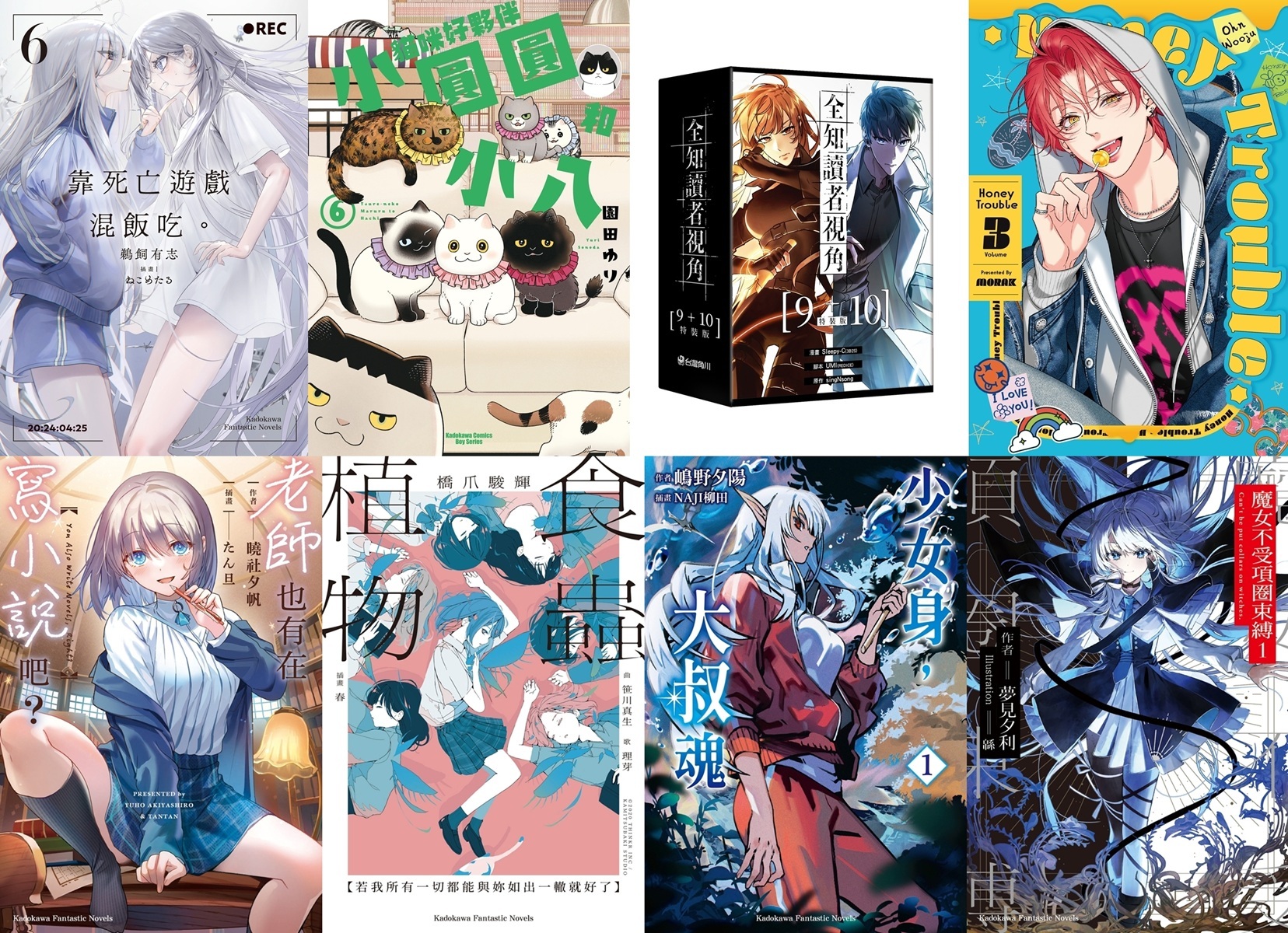 台灣角川「2025銀河祭」近期推薦強檔新書 ——日本動畫預定2026年1月開播的《靠死亡遊戲混飯吃。(6)》【特裝版】、流浪貓雙主角再度登場的感人系列《貓咪好夥伴小圓圓和小八 (6)》【特裝版】、全球矚目的韓國現象級奇幻鉅作《全知讀者視角 (9+10)》【特裝版】、萬眾矚目的韓國BL話題作《Honey Trouble 3》【特裝版】、以現實與虛構交錯為主題的《老師也有在寫小說吧?》、以跨界合作再現青春共鳴,改編自超人氣歌曲的小說《食蟲植物【若我所有一切都能與妳如出一轍就好了】》、顛覆定番公式的奇想轉生喜劇《少女身,大叔魂 (1)》、第30屆電擊小說大賞「大賞」得主《魔女不受項圈束縛 (1)》……等,眾多精彩作品將於近期陸續上市。
