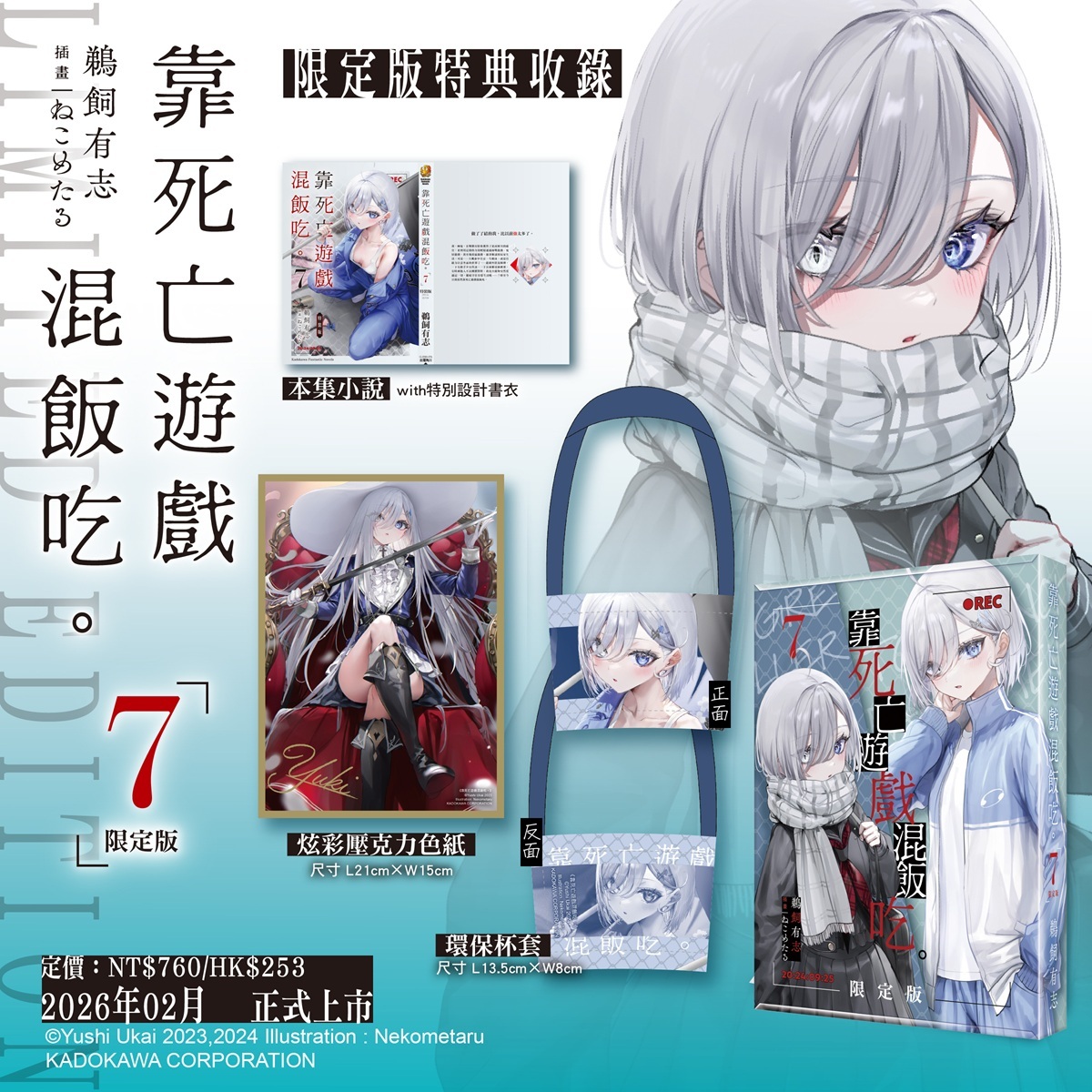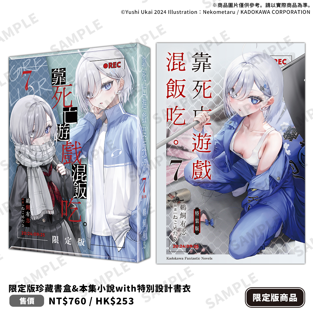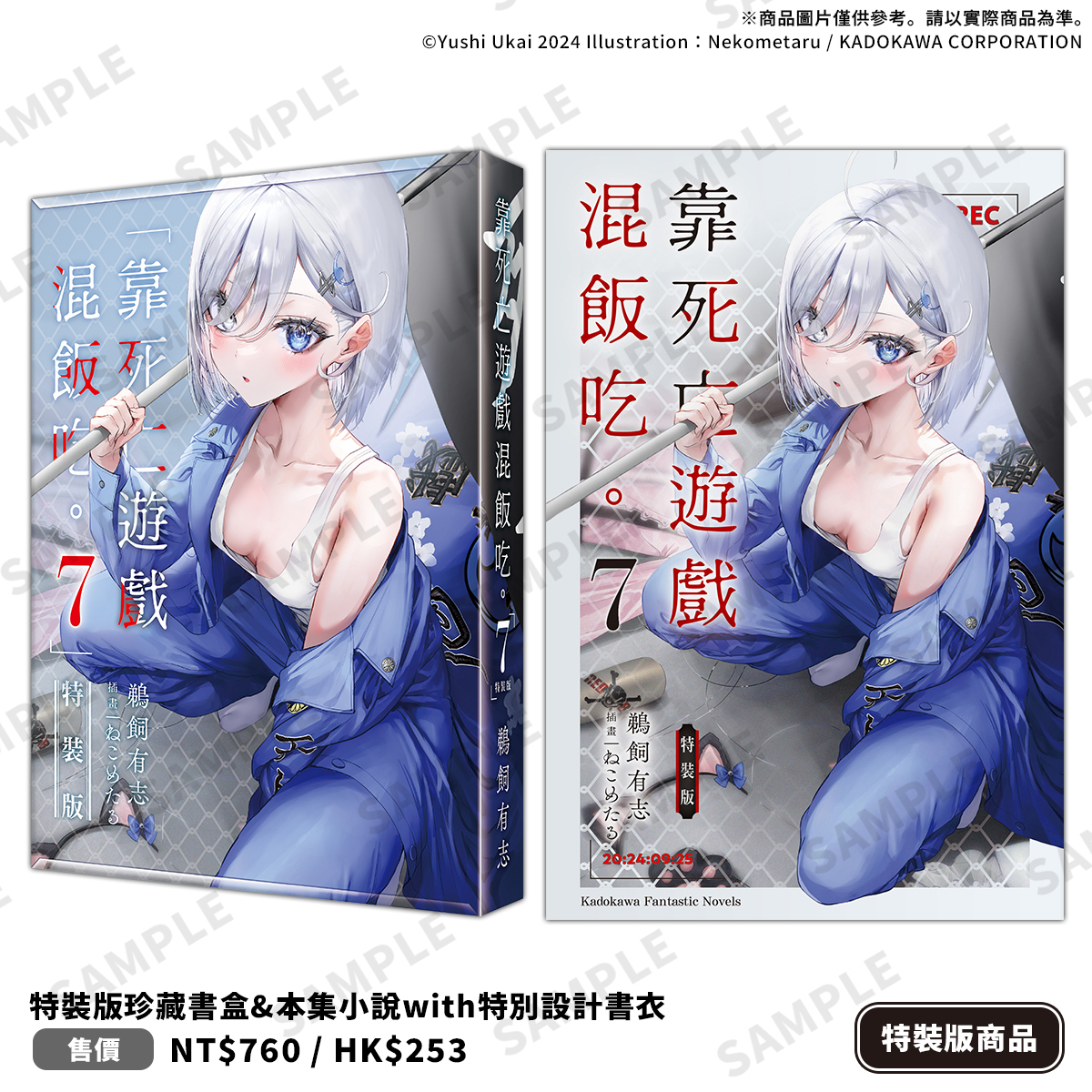 《靠死亡遊戲混飯吃。(7)》延續幽鬼於前一集中擊敗幻影後的劇情,主角感官能力全面提升,遊戲中所向披靡;然而現實世界卻風波不斷──殺手少女拜訪、公寓鄰居遭綁架、不良勢力鬥毆接連爆發,幽鬼不得不面對比遊戲更複雜的危機。限定版與特裝版兩種版本分別收錄不同主題角色精品,並皆附「本集小說with特別設計書衣」。限定版以幽鬼的雙造型為書盒設計,收錄可日常使用的「環保杯套」以及騎士風幽鬼的「炫彩壓克力色紙」。特裝版則以暴走族風的幽鬼做延伸,收錄與書盒圖樣同款造型的「3D光柵胸章」以及採長條布面呈現幽鬼全身泳裝線條的「應援毛巾」,無論偏好實用周邊或追求精緻角色圖的粉絲,都能找到最適合自己的版本。限定版將於台灣角川會場與官網獨家販售;特裝版自即日起開放事前限期預購至12/02(二)23:59,於台灣角川官網完成預購再加贈滿額優惠券100元。