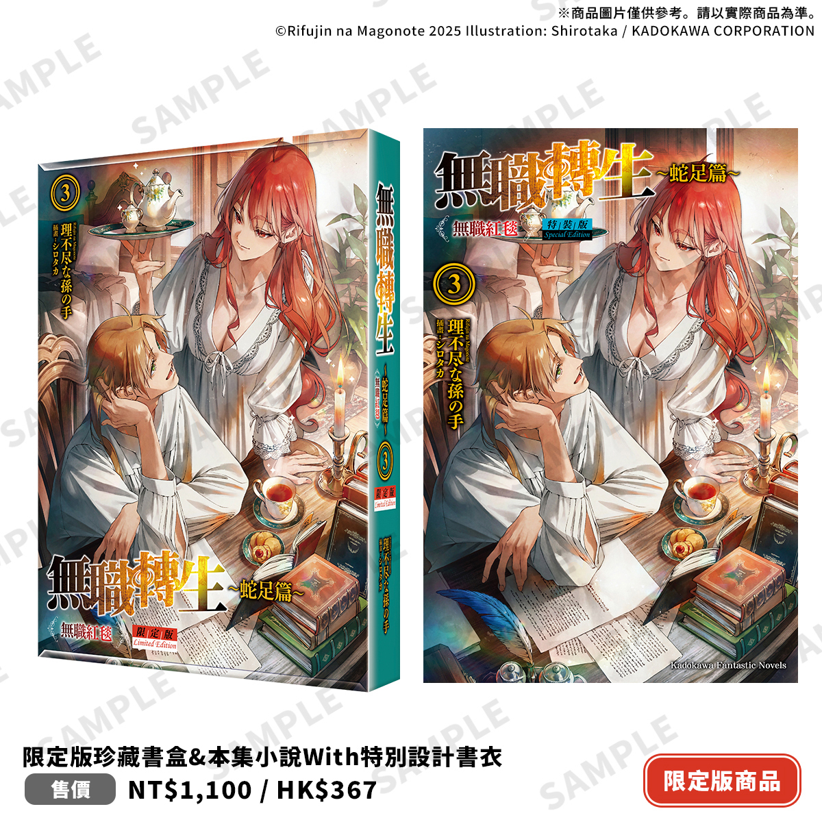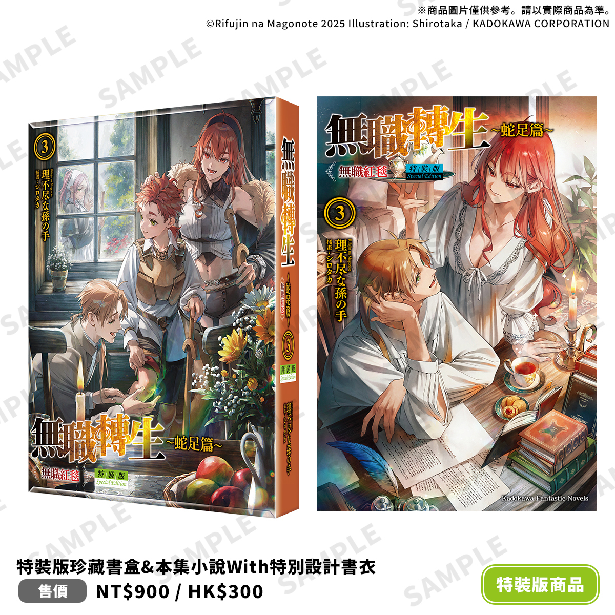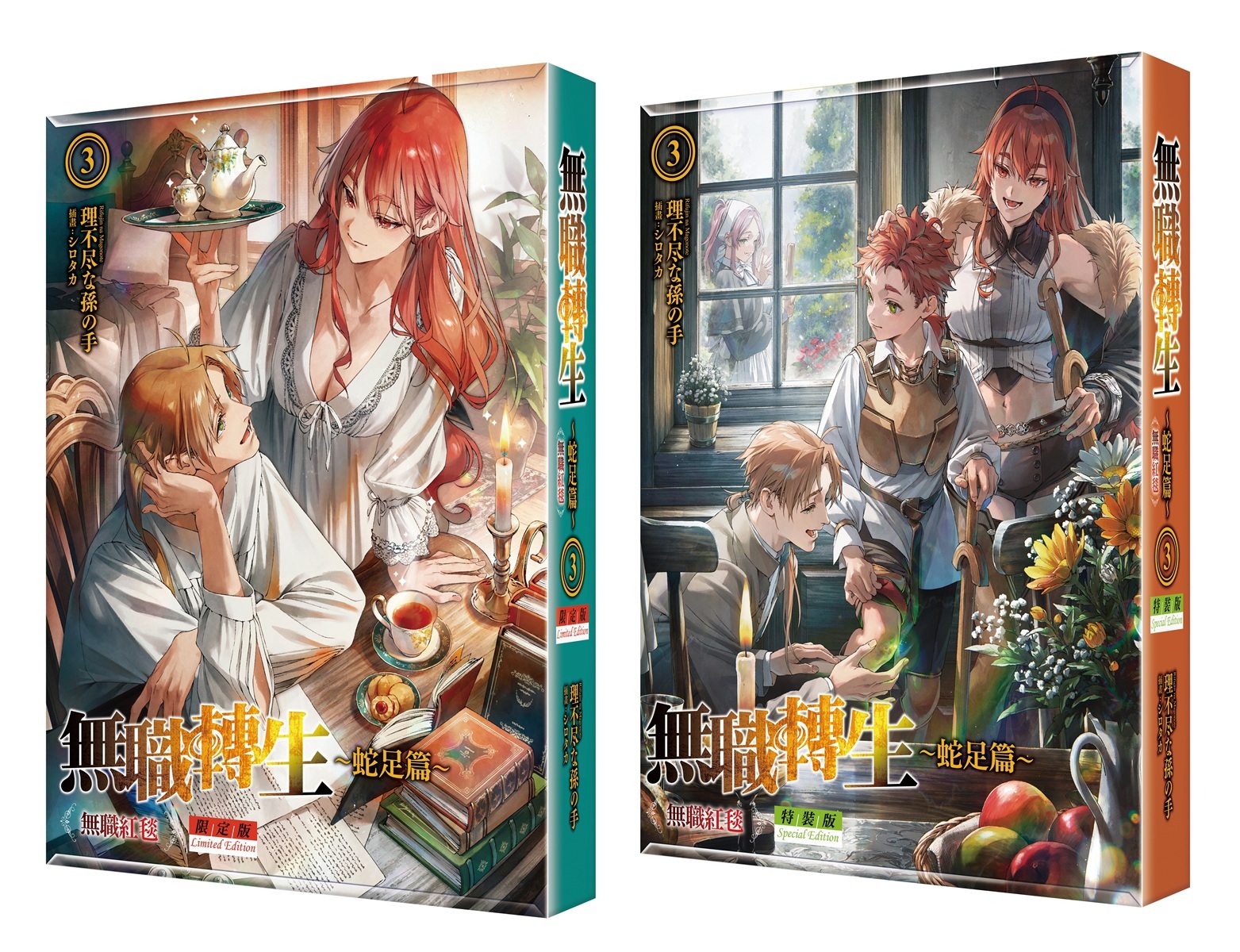 《無職轉生 ~蛇足篇~(3)》限定版以「摯愛相伴的寧靜時光」為主題打造專屬珍藏書盒,收錄特典:完整展現書核封面美感的「布掛畫(含組裝桿)」、三位老婆可愛立繪的「搖搖立牌」、值得紀念展示的「2入拍立得風小卡」以及「限定版8P短篇小冊子(〈菈菈看起來很寂寞〉、〈莉莉撒嬌〉兩則短篇)」;特裝版則是以「家族間的合影」為設計核心,特製書盒呈現魯迪替兒子亞爾斯治療的溫馨畫面,收錄特典:可直立展示全家福的「壓克力桌繪」、以精巧尺寸呈現高質感印製的「迷你無框畫」以及「特裝版8P短篇小冊子(〈露西生氣了〉、〈亞爾斯與商人〉兩則短篇)」;雙版本皆收錄「本集小說With特別設計書衣」。限定版僅限台灣角川會場與官網販售;特裝版則於全通路開放購買,現已開放事前預購至12/05(五),於官網完成預購再加贈滿額優惠券100元。