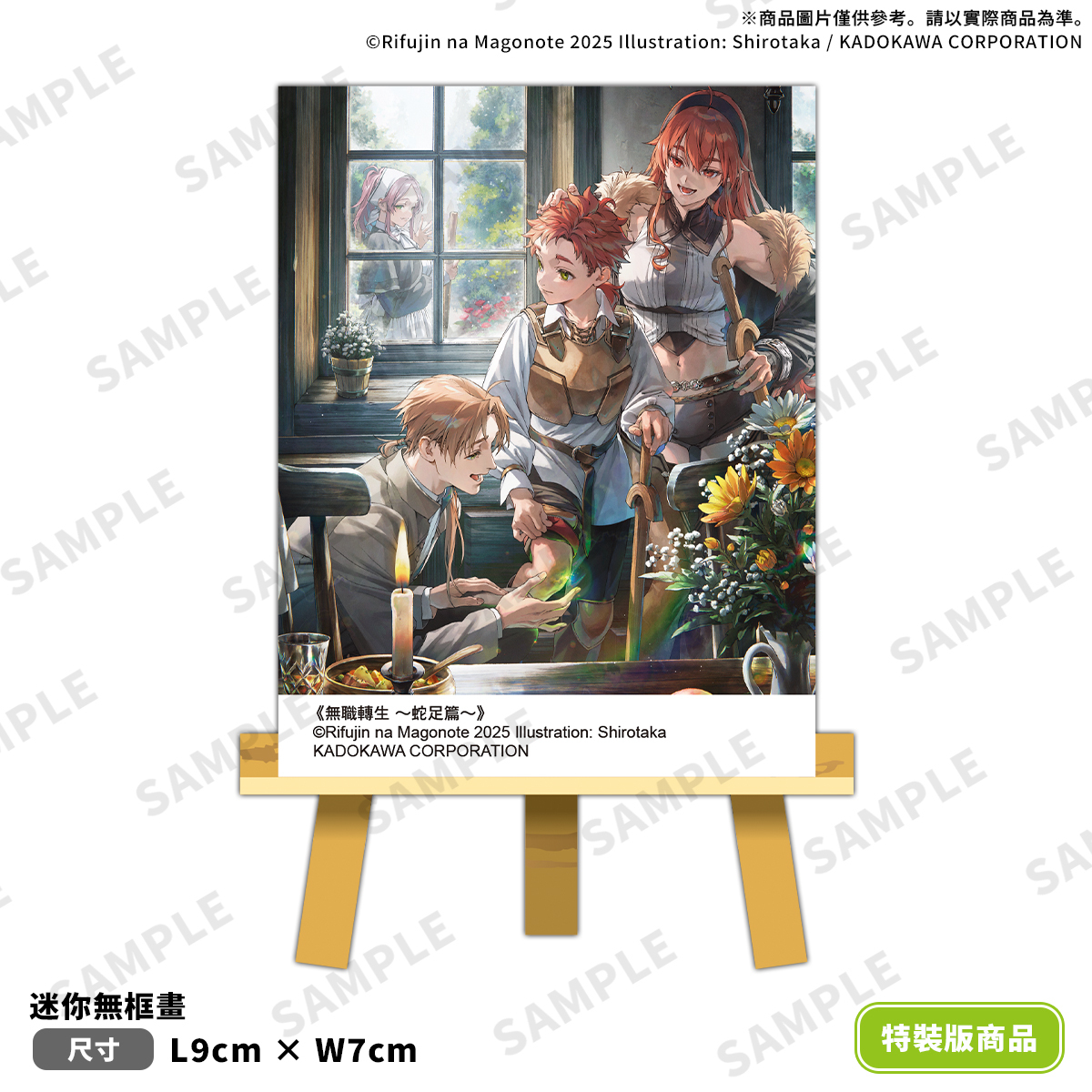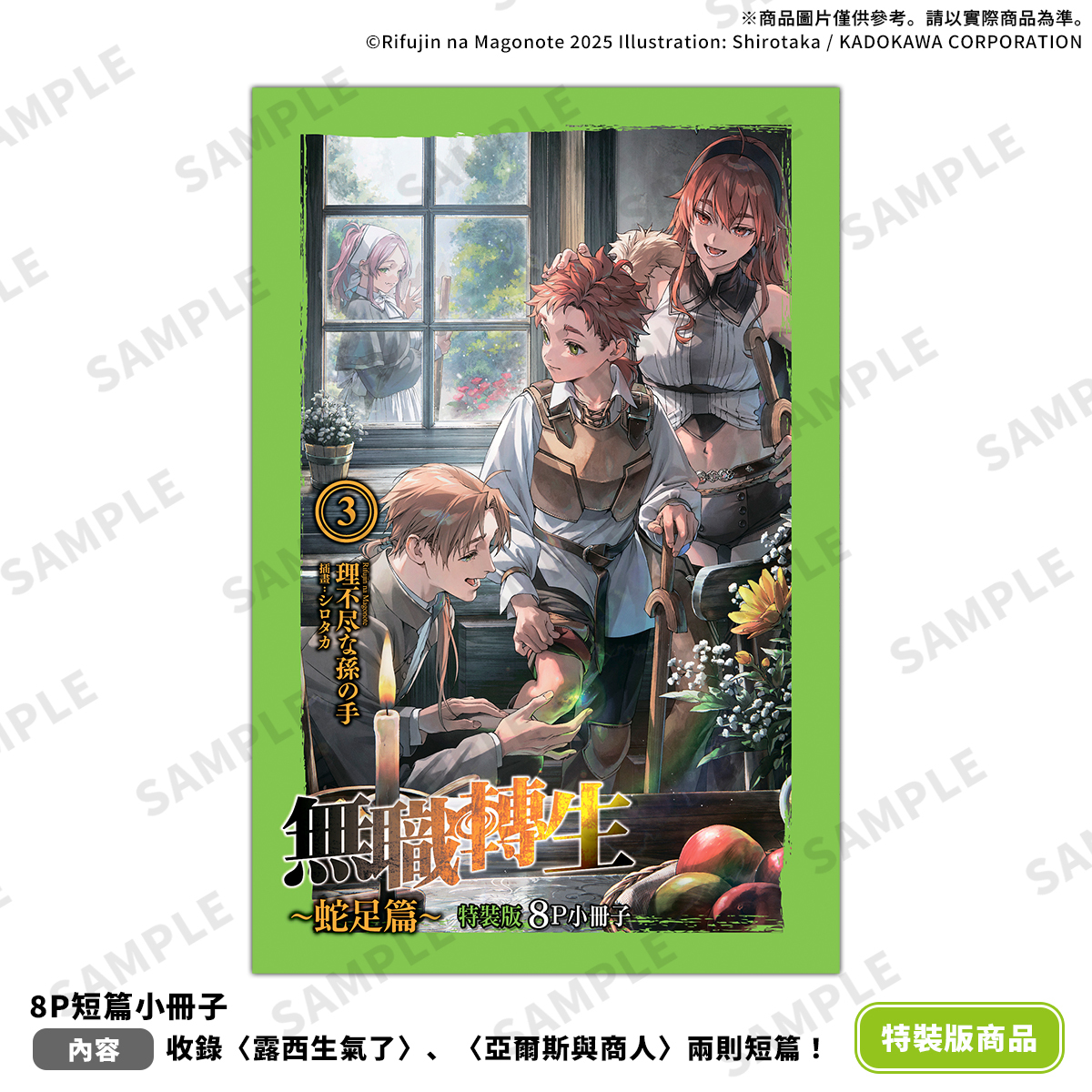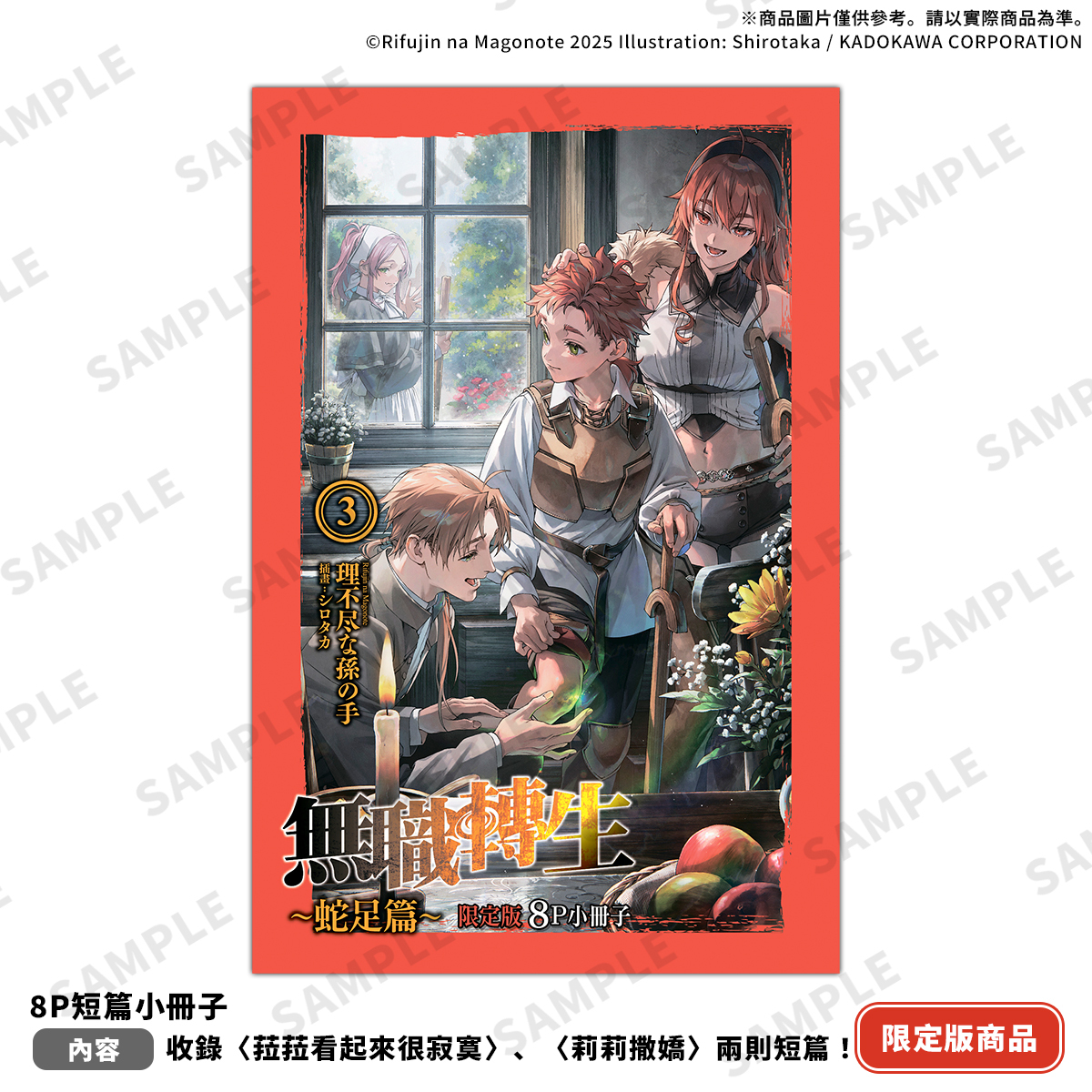 《無職轉生 ~蛇足篇~(3)》限定版以「摯愛相伴的寧靜時光」為主題打造專屬珍藏書盒,收錄特典:完整展現書核封面美感的「布掛畫(含組裝桿)」、三位老婆可愛立繪的「搖搖立牌」、值得紀念展示的「2入拍立得風小卡」以及「限定版8P短篇小冊子(〈菈菈看起來很寂寞〉、〈莉莉撒嬌〉兩則短篇)」;特裝版則是以「家族間的合影」為設計核心,特製書盒呈現魯迪替兒子亞爾斯治療的溫馨畫面,收錄特典:可直立展示全家福的「壓克力桌繪」、以精巧尺寸呈現高質感印製的「迷你無框畫」以及「特裝版8P短篇小冊子(〈露西生氣了〉、〈亞爾斯與商人〉兩則短篇)」;雙版本皆收錄「本集小說With特別設計書衣」。限定版僅限台灣角川會場與官網販售;特裝版則於全通路開放購買,現已開放事前預購至12/05(五),於官網完成預購再加贈滿額優惠券100元。