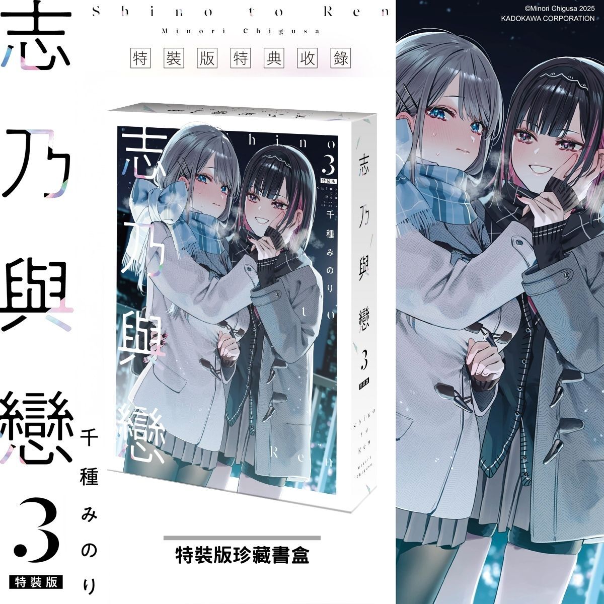 《志乃與戀 (3)》封面及「特裝版珍藏書盒」以兩位女主角早乙女志乃與白雪戀的冬日外出約會、暖心相依偎為主題,充滿浪漫氛圍。特裝版內收錄多項限定特典,包括志乃在校慶鬼屋中的扮相「妖怪出現啦!志乃壓克力立牌」、呈現戀人視角的「4入圖卡組」,以及「單行本第三集&精美典藏書卡」,完整收藏兩人甜蜜互動的美好瞬間。《志乃與戀 (3)》特裝版自11/25(二)起於全台指定通路開放限期預購,至12/8(一)23:59止,期間於台灣角川官網完成預購,再加碼贈送官網滿額優惠券100元。