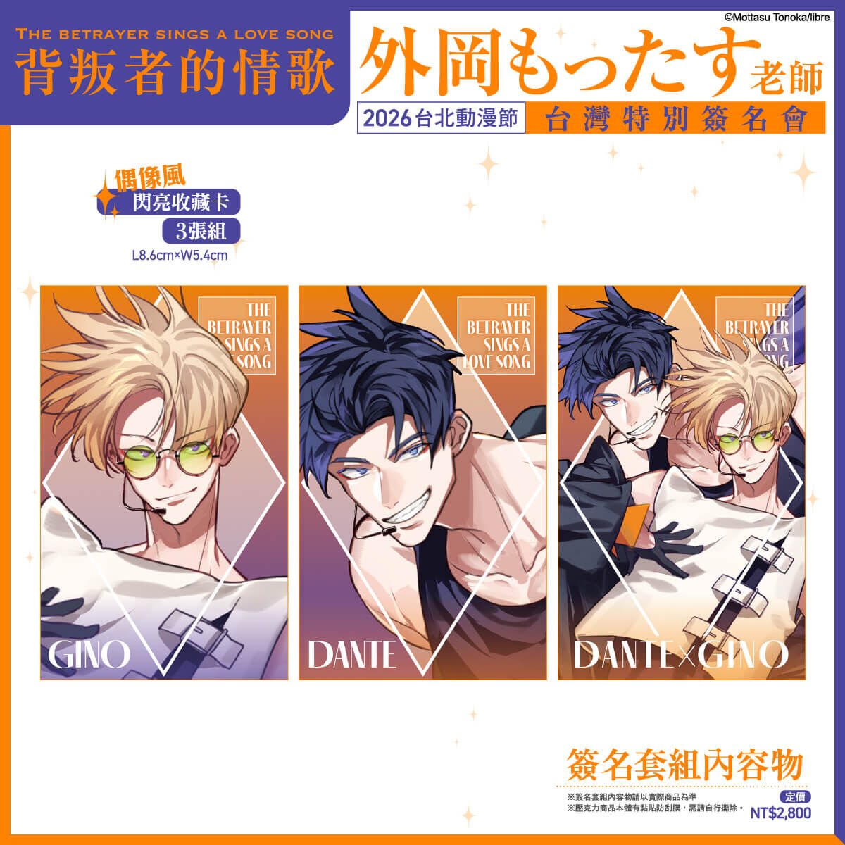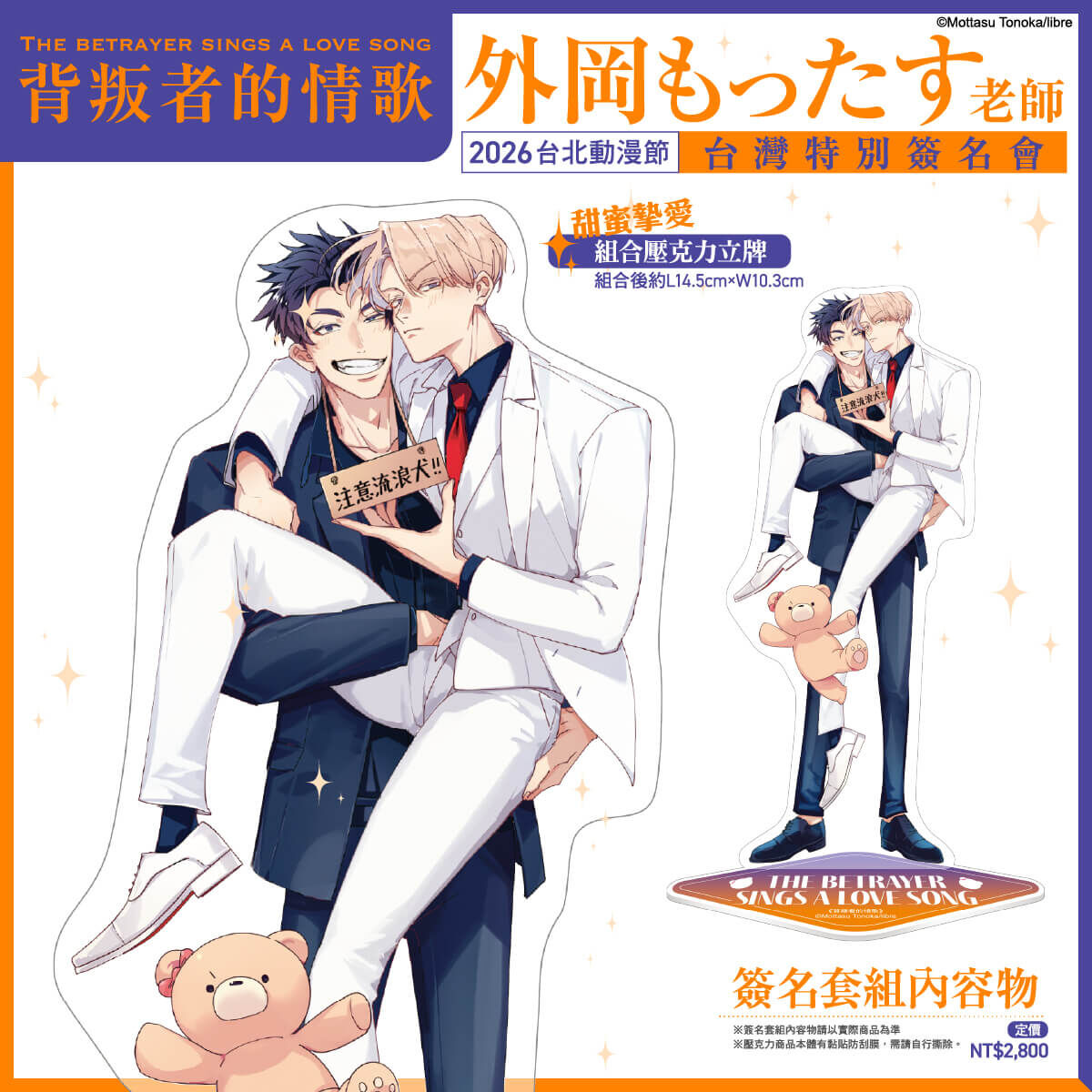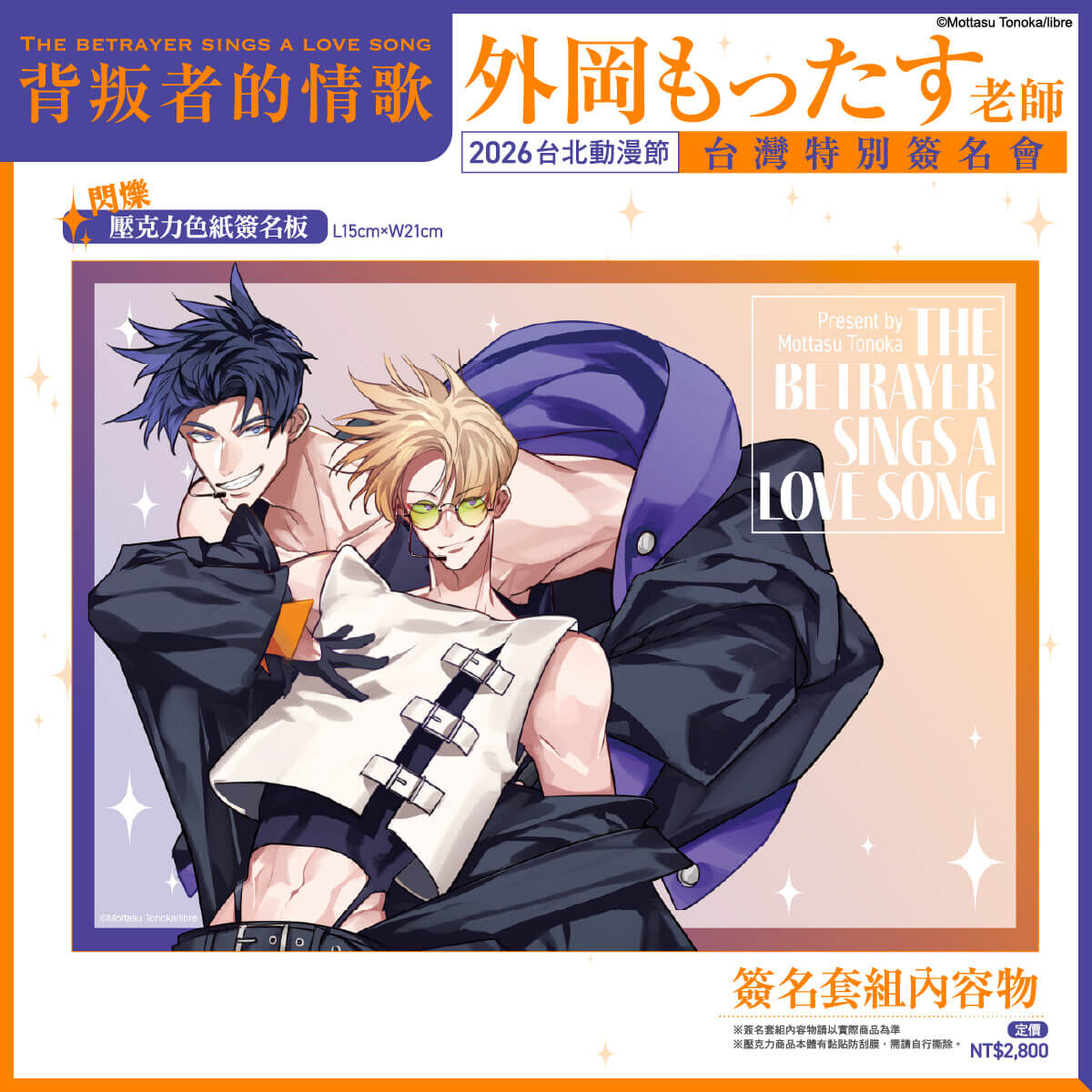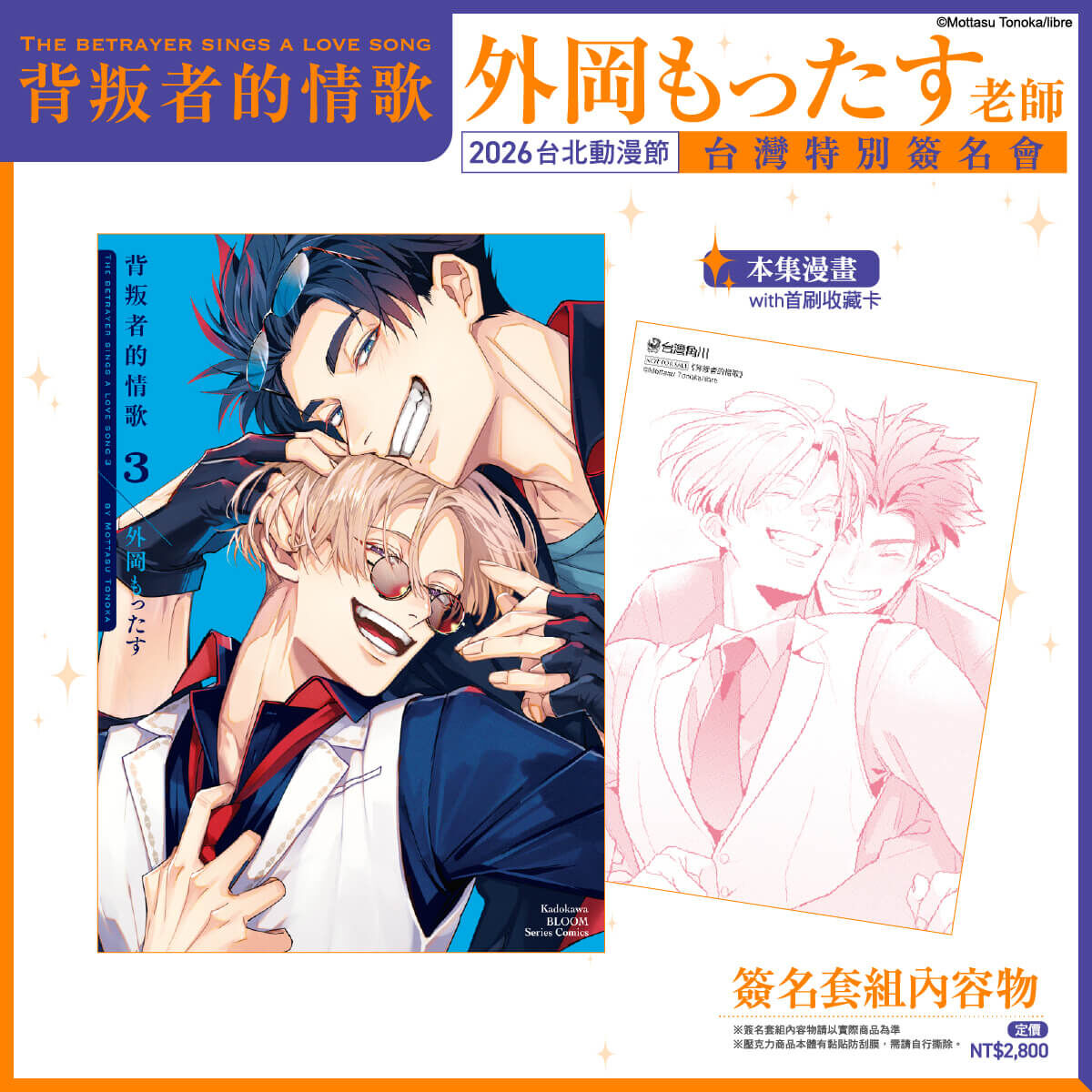 2026台北國際動漫節即將於明年盛大登場,台灣角川今日正式公布本屆重點舞台活動情報──超人氣黑手黨戀愛BL漫畫《背叛者的情歌》作者外岡もったす老師將首度來台舉辦特別簽名會。這是作者首次與台灣讀者近距離交流,現場將深入分享創作歷程與趣聞、人氣角色們的設定靈感並獨家揭露故事發展!活動將於2026年2月6日(五)在動漫節會場及安利美特台北店盛大舉辦,有興趣的讀者朋友們請把握難得機會!為了台灣讀者特別畫的「全新偶像主題特繪圖」《背叛者的情歌》簽名資格套組,將在12月底於台灣角川官網開放登記抽選,全台僅限量220組的購買資格,詳細辦法請至官網或粉絲團查詢。