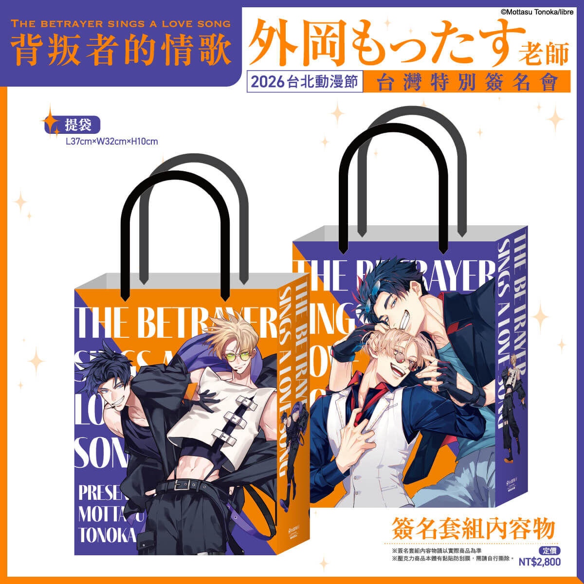 《背叛者的情歌》講述溺愛攻 ×強氣受,異國黑手黨首領間的愛情故事,菸味與糖果甜膩香氣瀰漫繚繞,濃烈愛意與背叛、信任與犧牲交織出一曲危險卻無法抗拒的戀歌。簽名資格套組限定收錄以兩位主角「吉諾」與「但丁」帥氣偶像主題設計「壓克力色紙簽名板」、「應援毛巾」、「閃亮收藏卡3張組」與愛侶超甜蜜可愛互動「組合壓克力立牌」;以及「《背叛者的情歌(3)》(附首刷小卡)」皆收錄於絕讚有型的「紙製提袋」。