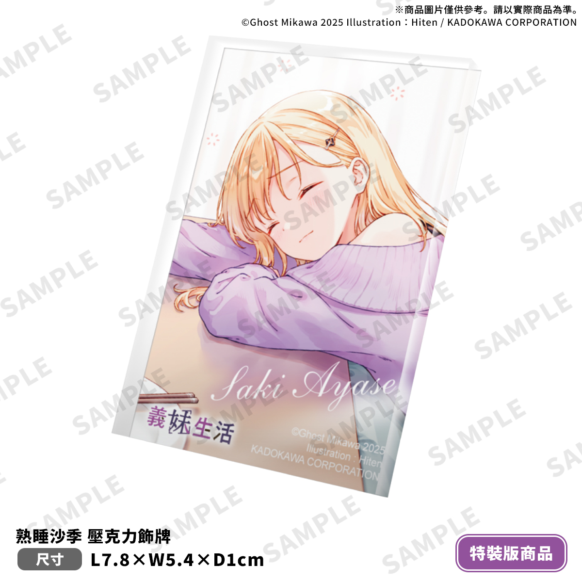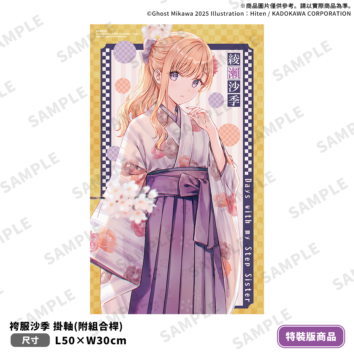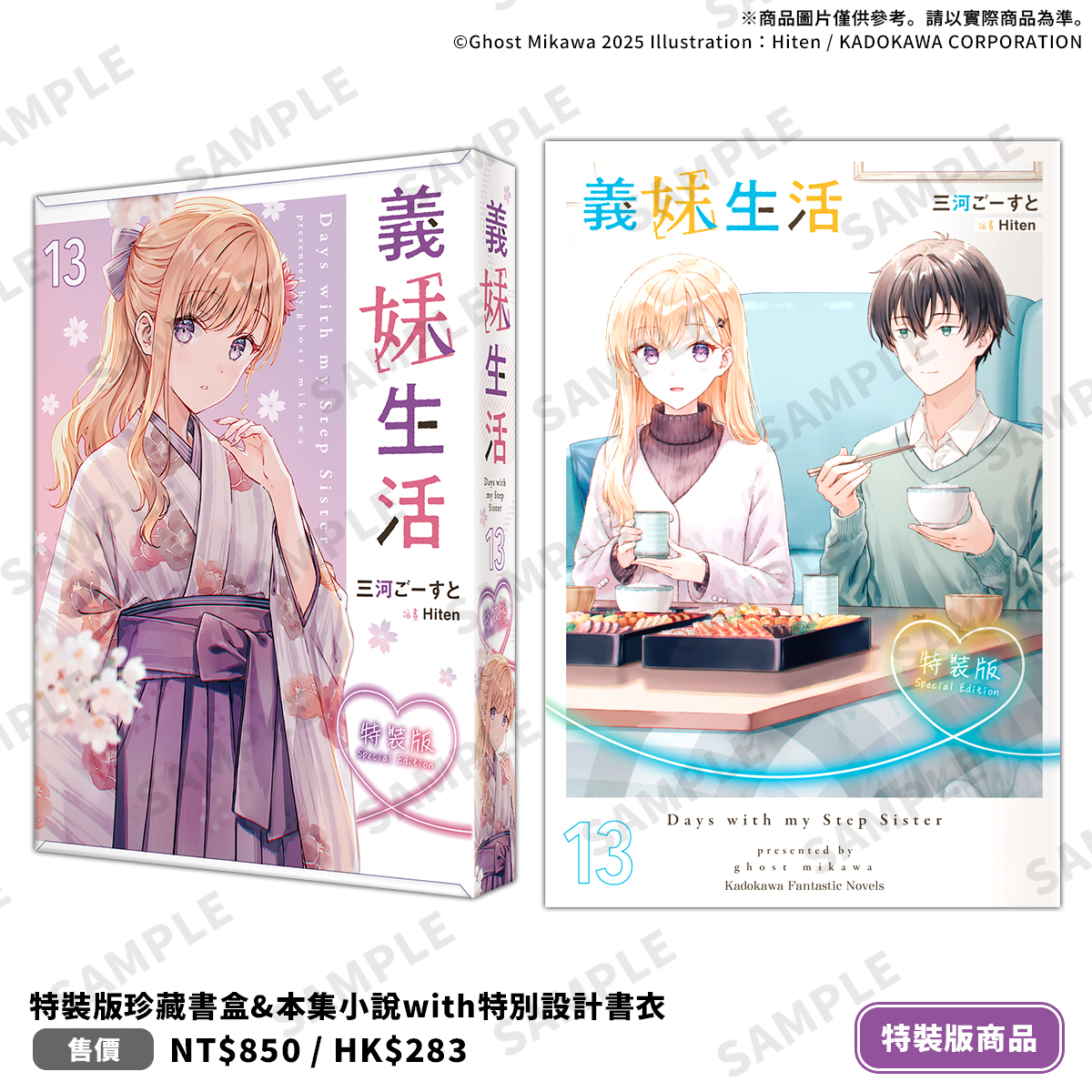 《義妹生活 (13)》特裝版以沙季身著和風服裝、散發沉穩成熟氣質的插圖作為主視覺,呈現出與過往截然不同的成長穩重感。特裝版收錄內容呼應本集「靜靜相伴、共同迎向未來」的主題,將各種面貌的沙季都展現出來。收錄特典:「本集小說With特別設計書衣」、和服造型的「袴服沙季 掛軸(附組合桿)」,以及卸下日常防備後柔和表情的「熟睡沙季 壓克力飾牌」。特裝版預計自即日起開放事前預購至2026年1月5日(一)23:59,若於台灣角川官網完成預購再加贈滿額優惠券100元。喜愛本作的讀者敬請把握。