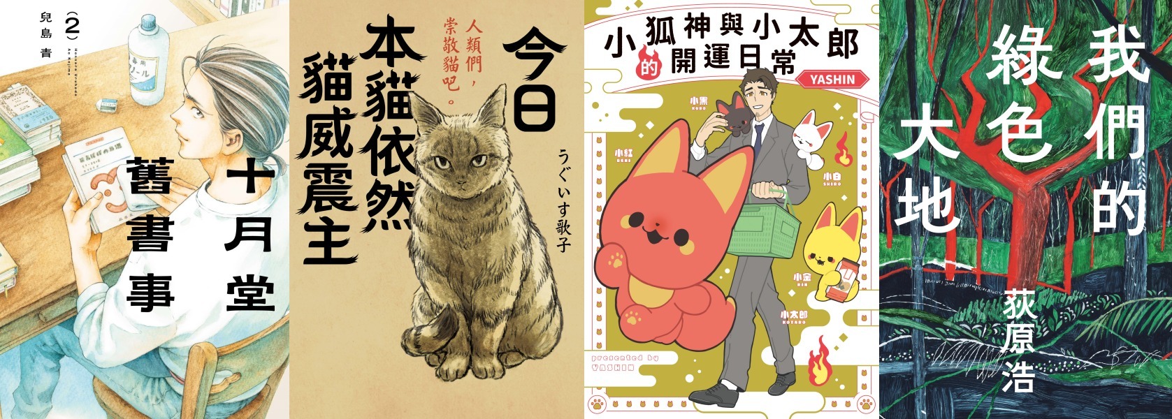 一般書新刊,包括獲獎不斷,台日超高口碑評價的《十月堂舊書事 2》;兩本SNS人氣圖文創作,描述貓主子吐嘈人類生活的《今日本貓依然貓威震主》和暖心可愛又很適合過年閱讀的《小狐神與小太郎的開運日常》;同時也為喜愛文學的讀者帶來日本小說家‧荻原浩的新作《我們的綠色大地》。