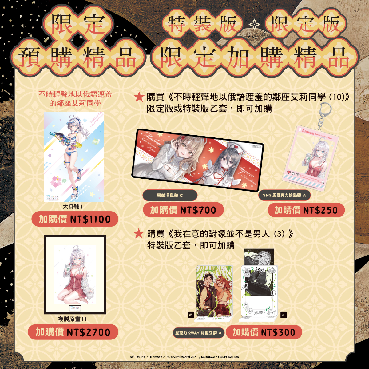 於會場購買《不時輕聲地以俄語遮羞的鄰座艾莉同學 (10)》限定版or特裝版即可加購電競滑鼠墊 C 與SNS風壓克力鑰匙圈 A;購買《我在意的對象並不是男人 (3)》特裝版即可加購壓克力2WAY相框立牌 A。
