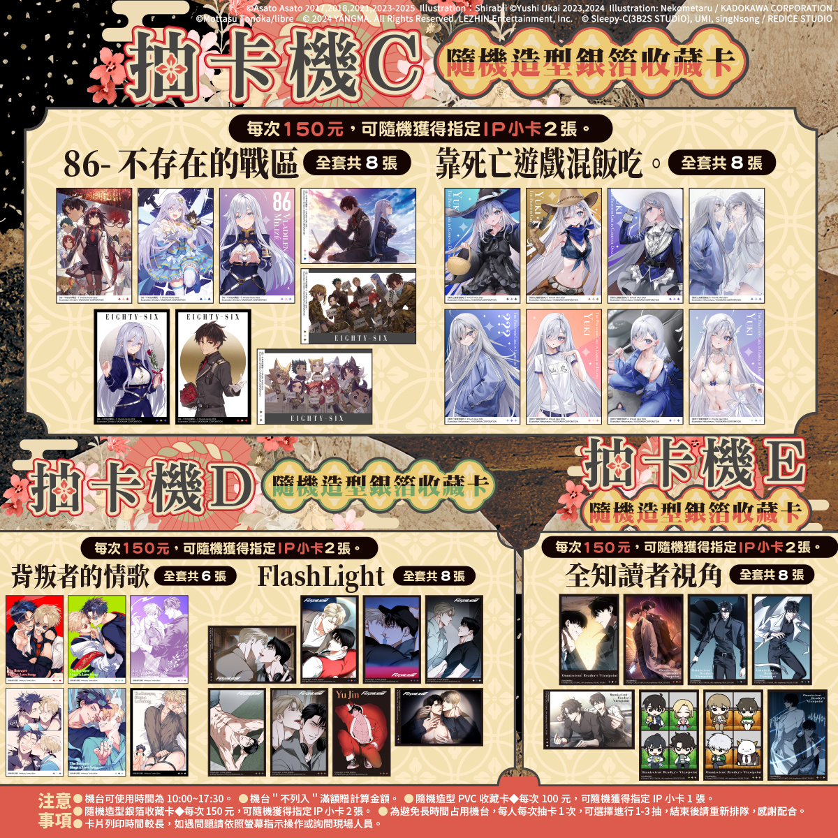 全場最吸睛的驚喜角落,今年抽卡機再添新作品!A~E五大機台九部超人氣 IP!其中抽卡機A為台灣人氣原創作品《Madder & Teal》!本次特別邀請作者 海塩子老師為會場機台親自繪製全新圖面,這部以音樂與獨特雙色調譜出的治癒系戀曲,看徐雪與夏月換上新造型,喜愛的粉絲絕對不能錯過!