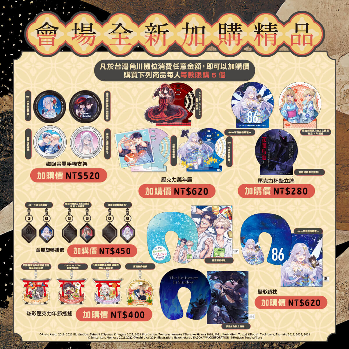 凡於會場消費任意金額即可加購多款全新精品,集結《86─不存在的戰區─》、《約會大作戰》、《魔法偵探時崎狂三回顧錄》、《靠死亡遊戲混飯吃。》、《背叛者的情歌》、《不時輕聲地以俄語遮羞的鄰座艾莉同學》、《我想成為影之強者!》、《歡迎來到實力至上主義的教室》多部超人氣作品角色的周邊,包括壓克力萬年曆、壓克力杯墊立牌、變形頸枕,還有質感滿分的磁吸金屬手機支架、金屬旋轉掛飾以及設計俏皮的炫彩壓克力年節搖搖,敬請把握機會帶回家!