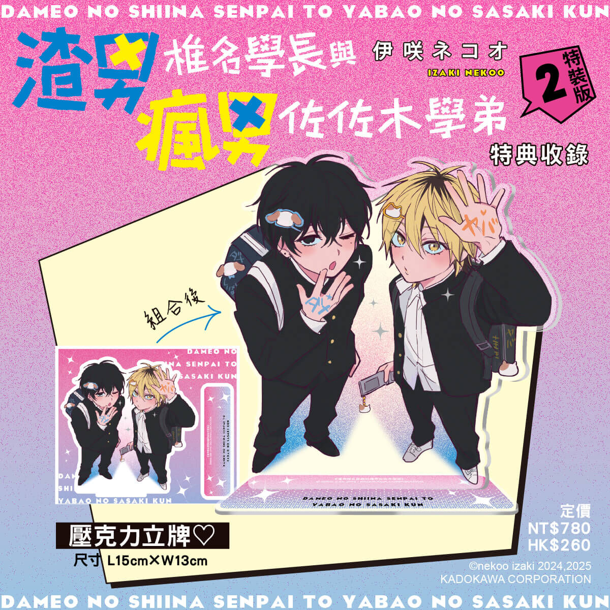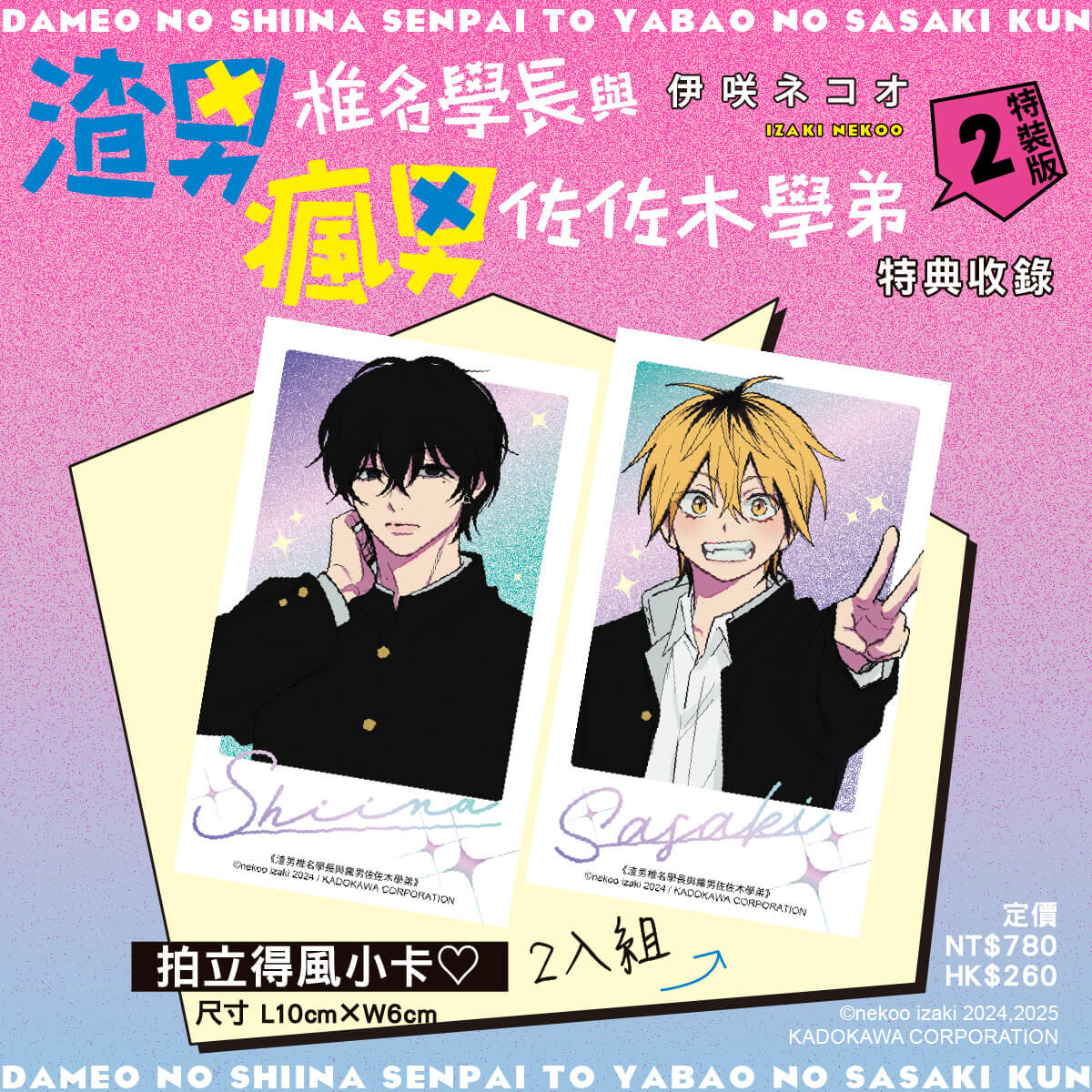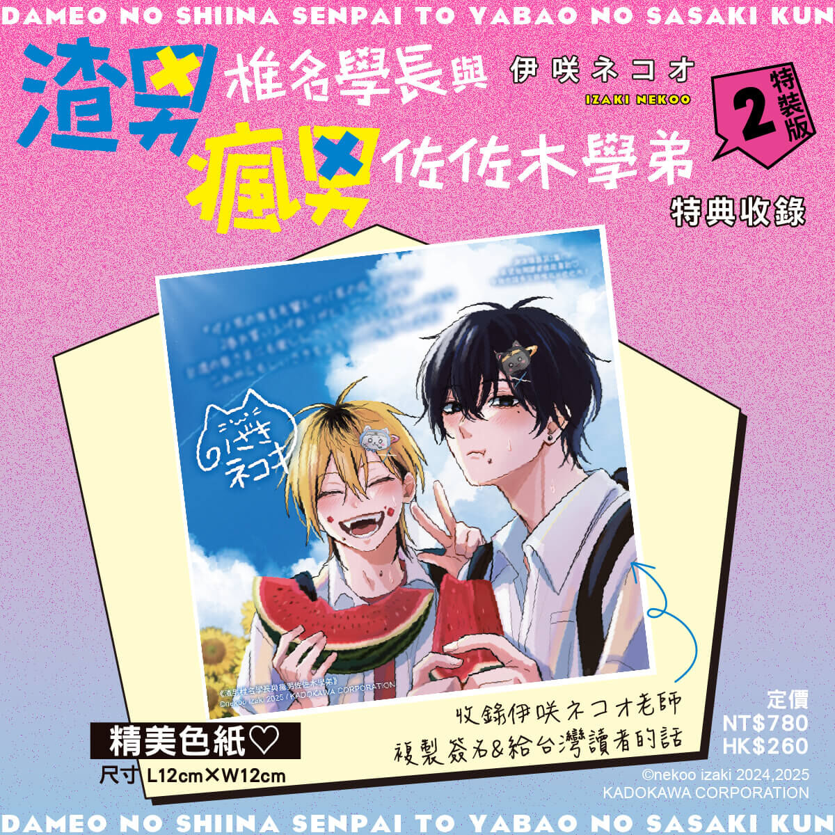 《渣男椎名學長與瘋男佐佐木學弟 (2)》特裝版收錄多項特典──充滿夏日青春氛圍的「精美色紙」,特別收錄作者伊咲ネコオ老師的珍貴複製簽名以及寫給台灣讀者的話;「壓克力立牌」及「拍立得風小卡2入組」可愛度破表的學長學弟兩人的日常校服帥氣模樣值得珍藏!上述特裝版限定特典與「本集漫畫(隨書附贈首刷書卡)」皆收錄於「特裝版珍藏書盒」,特裝版自即日起開放全台指定通路事前預購至2/9(一),凡於台灣角川官網(https://kadokawa.io/B0TXO)完成預購再加碼贈送滿額優惠券100元(每會員限使用/領取乙次,使用期限為60天)。讀者朋友敬請把握限期預購機會以免向隅。