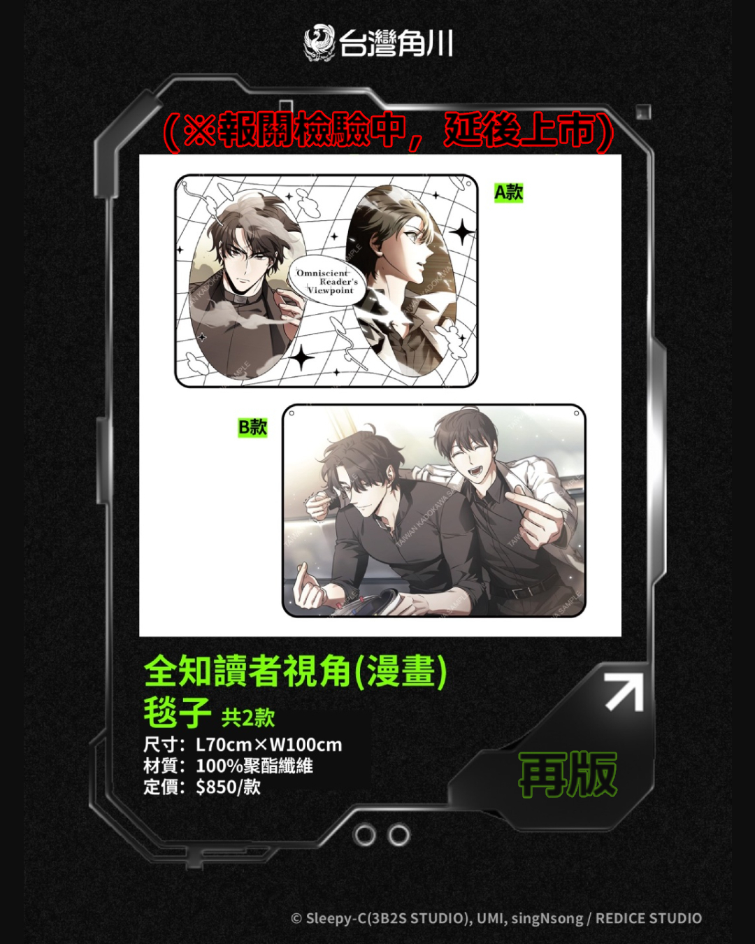 ※「全知讀者視角(漫畫) 毯子 A、B 款」目前因報關抽驗無法如期送達,