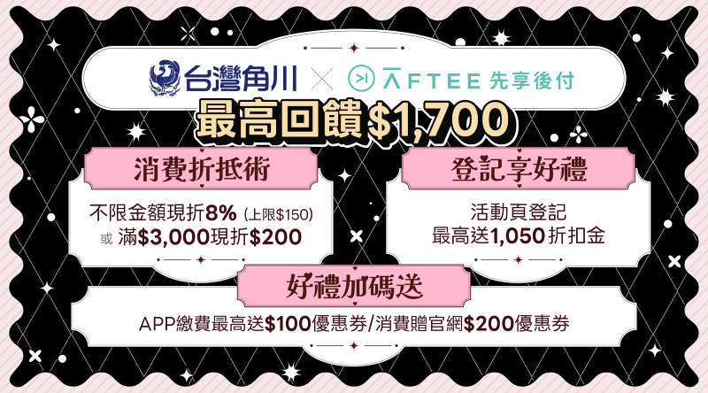 活動說明:活動期間內,凡AFTEEX用戶於【台灣角川】消費不限金額,並使用【AFTEE先享後付】結帳,即可享實際消費金額8%現折回饋,單筆訂單現折回饋上限$150。回饋不限名額。每個AFTEE帳號限回饋一次。