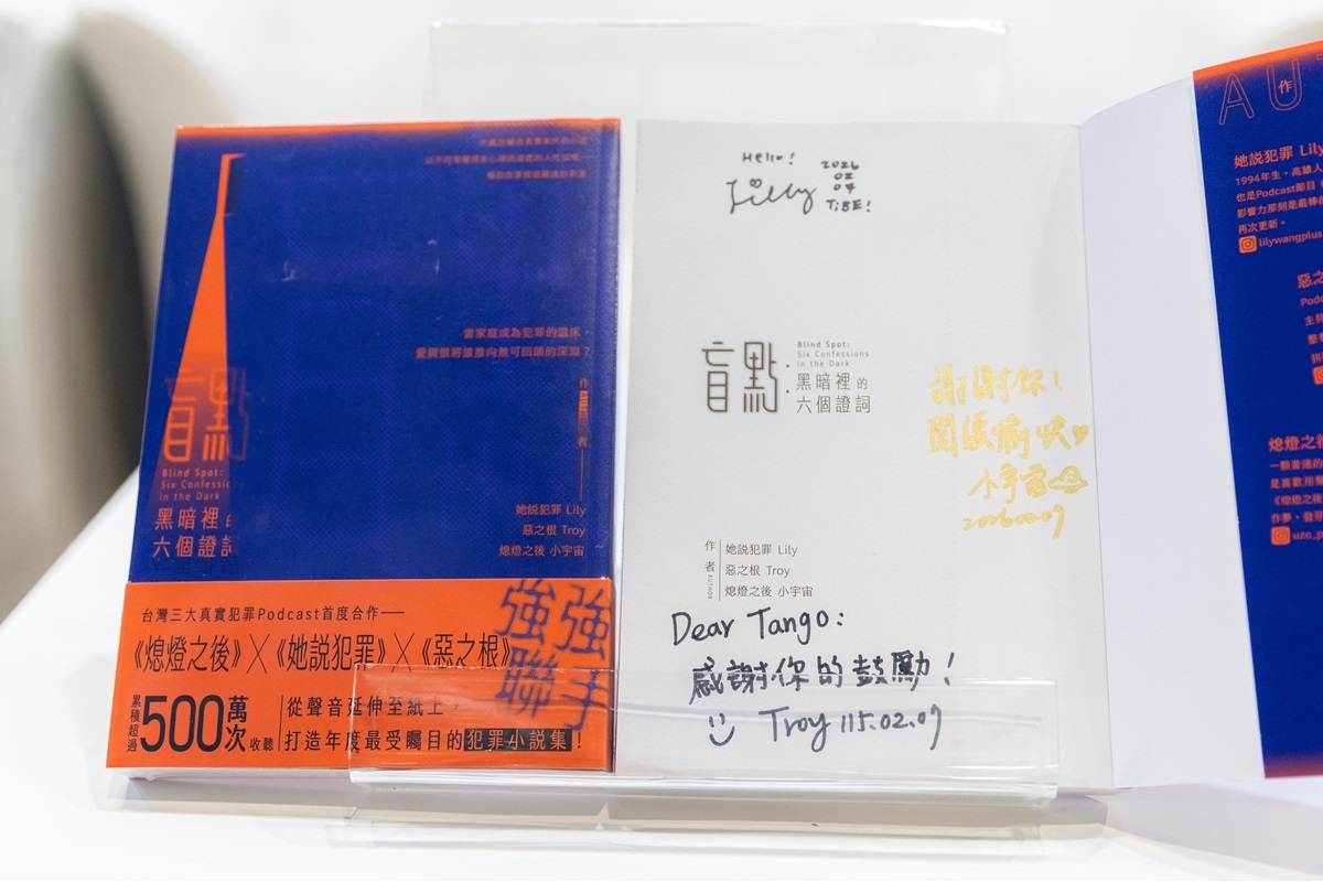 在這場跨界創作的嘗試中,Lily、Troy與小宇宙以各自擅長的敘事方式,為真實犯罪書寫開啟全新想像。《盲點:黑暗裡的六個證詞》已於台北國際書展亮相並正式上市,讀者不僅能在書中感受六段精彩的故事內容,也能看見三位 Podcaster從聲音到文字的嶄新面貌,體驗不一樣的犯罪閱讀視角。