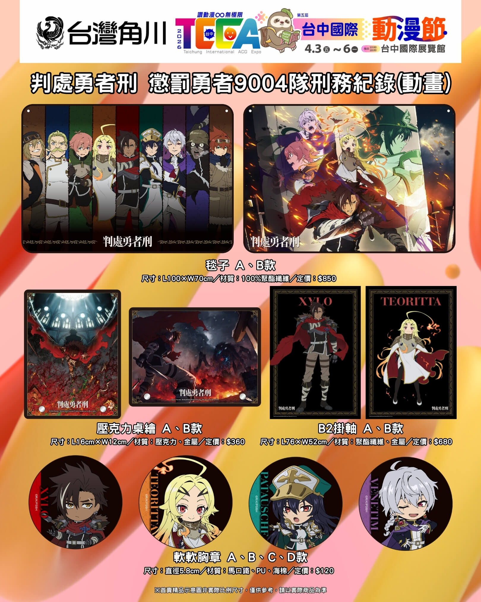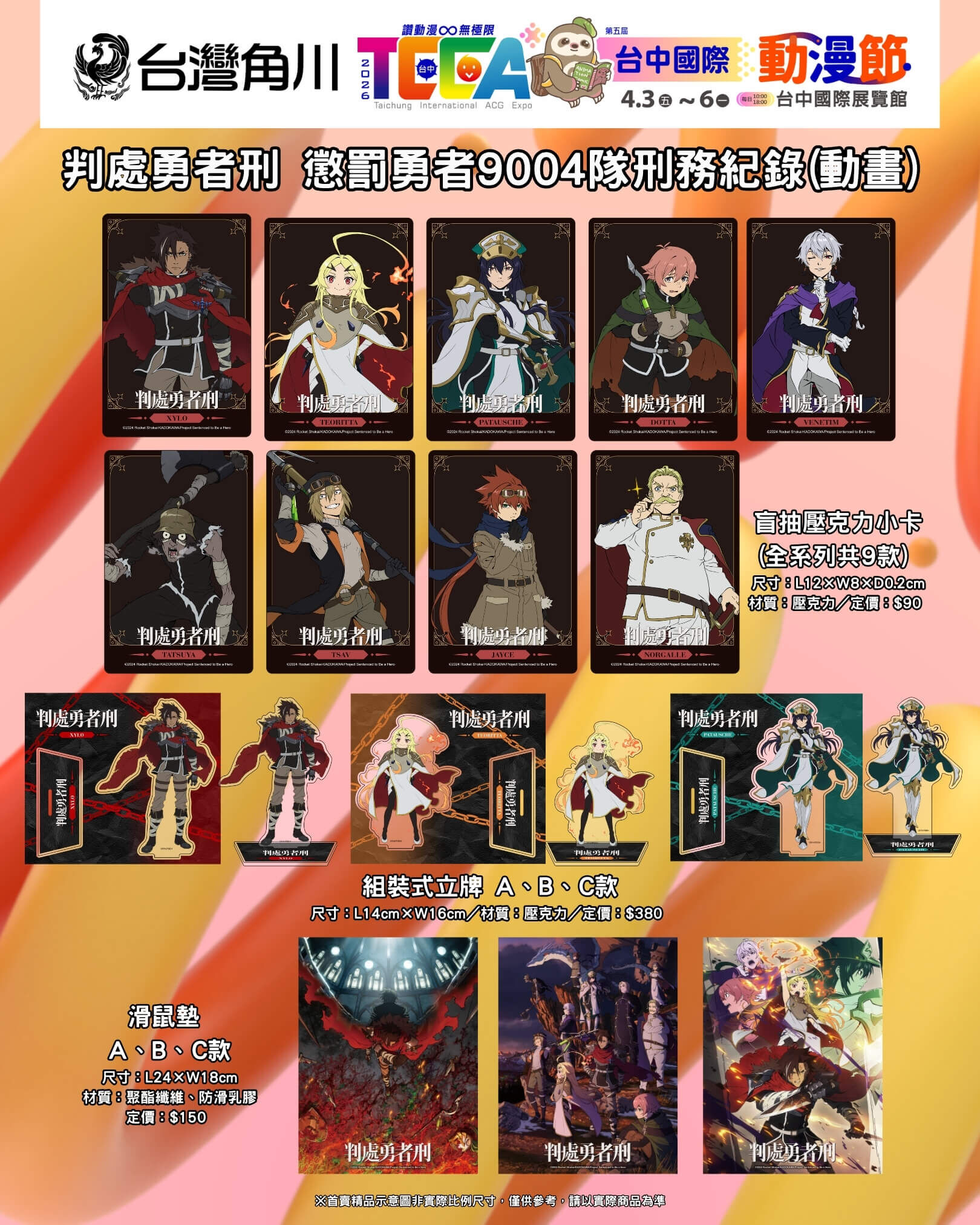 隨著動畫化掀起高熱度,極惡勇者的絕讚進擊──《判處勇者刑 懲罰勇者9004隊刑務紀錄》本次展出的精品從打造居家氛圍的「門簾」、質感厚實的「毯子」與「小抱枕」,到具備收藏價值的「透明立方」與「B2掛軸」,完美呈現各具魅力的角色群與霸氣十足的磅礡世界觀。首度推出的「盲抽壓克力小卡」共有 9 款,極具收集樂趣。