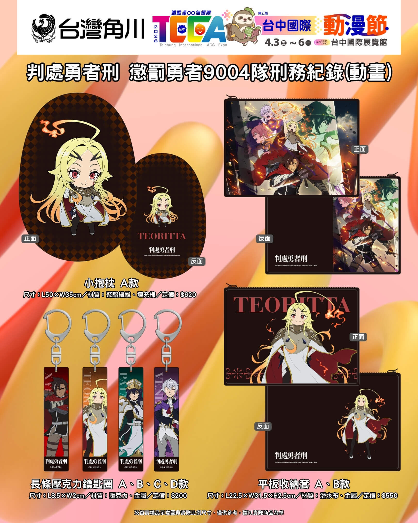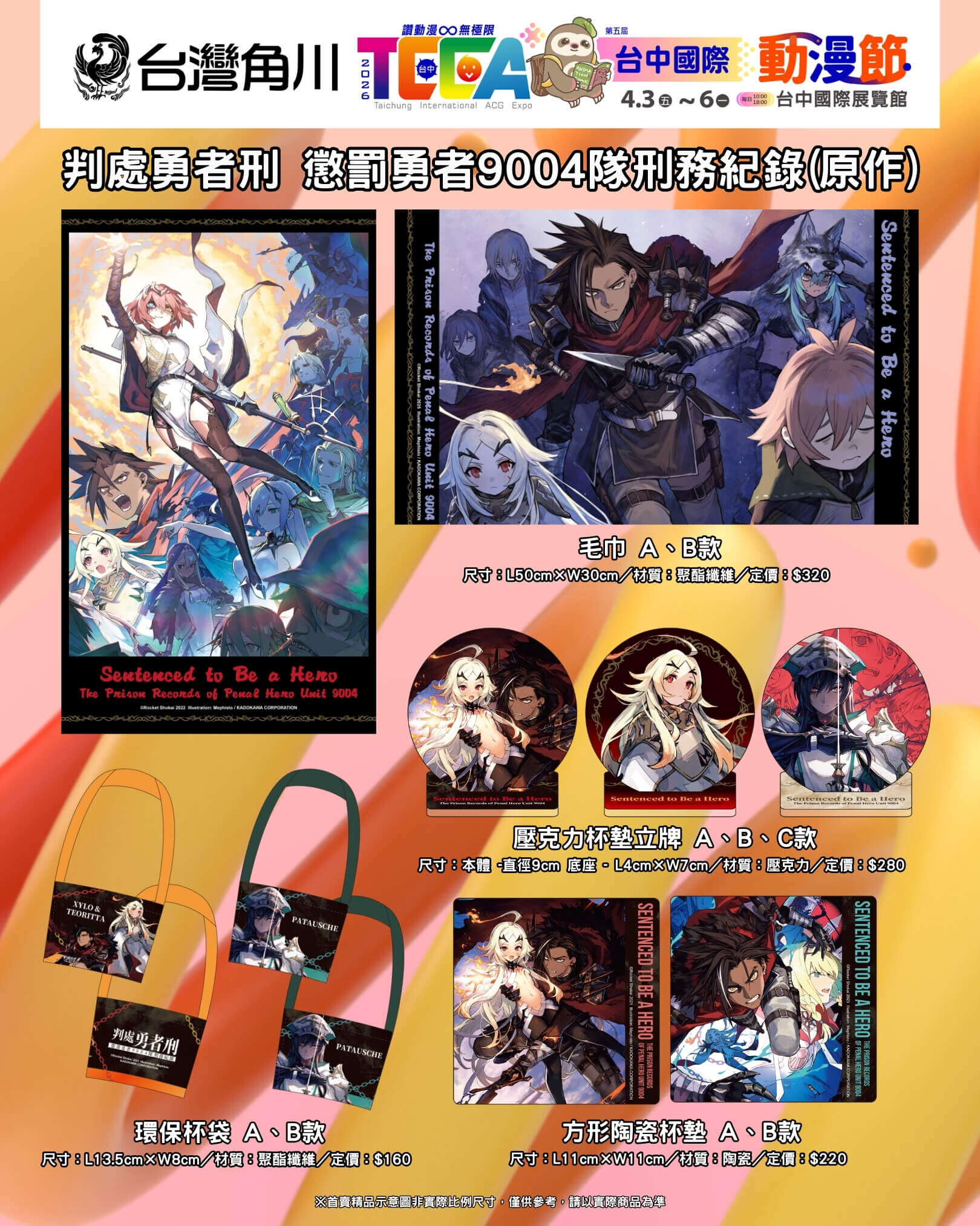本次由本季動畫霸權番──黑暗奇幻史詩《判處勇者刑 懲罰勇者9004隊刑務紀錄》領軍,一口氣推出高達 47 款動畫與原作精品,並同步推出《不時輕聲地以俄語遮羞的鄰座艾莉同學》、《DATE A LIVE 約會大作戰》、《靠死亡遊戲混飯吃。》等人氣作;以及BL話題作《FLASHLIGHT》與《在對死黨的同居要求說「好」之前》,共推出近百款質感滿載的限定周邊,準備搶攻粉絲的荷包!帶來最極致的視覺饗宴與收藏滿足。