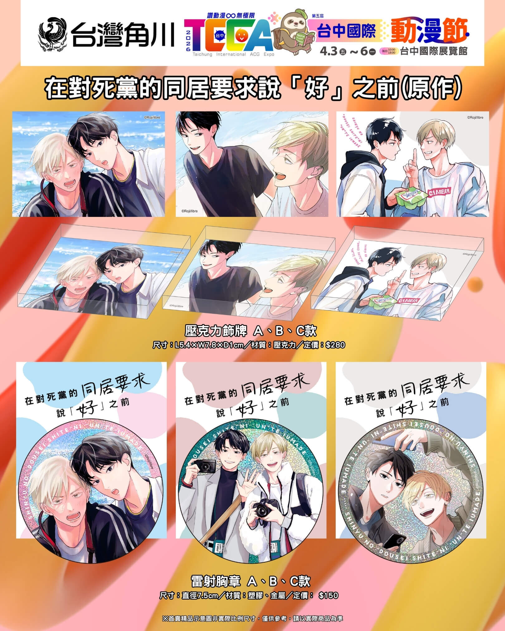 BL系列有韓漫《FLASHLIGHT》與日系純愛作《在對死黨的同居要求說「好」之前》,推出粉絲最愛大尺寸「雷射胸章」與「壓克力飾牌」完整收藏角色超有愛經典畫面。更多2026台中國際動漫節首賣精品資訊,歡迎至官網查詢 https://kadokawa.io/kQo5i。