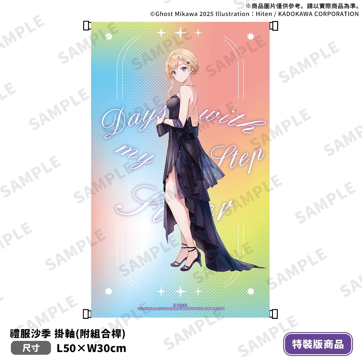 《義妹生活 another days》特裝版以身穿優雅黑色晚禮服、展露迷人姿態的沙季作為主視覺,呈現出有別於日常的成熟與高貴氣質。本次特裝版收錄包含:「本集小說 With 特別版書衣」、展現華麗氣場的「禮服沙季 掛軸(附組合桿)」,以及帶點憂鬱唯美氛圍的「雨中沙季 壓克力鑰匙圈」。特裝版預計自4月7日起開放事前預購至4月21日(二)23:59為止,若於台灣角川官網完成預購再加贈滿額優惠券100元。