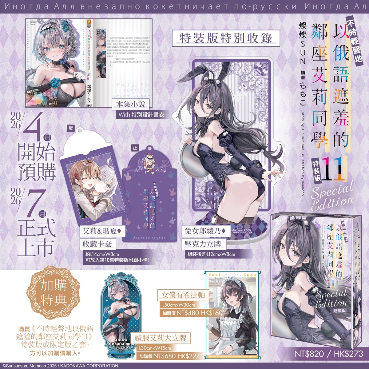《不時輕聲地以俄語遮羞的鄰座艾莉同學 (11)》(特裝版)即日起於台灣角川官網及全台指定通路進行事前預購,期間開放至 5/4(一) 23:39 為止。凡於官網預購再加碼贈送滿額優惠券100元(每會員限使用/領取乙次,使用期限為60天)。集結校園女神們最美瞬間的雙版本,將在 2026 漫畫博覽會獨家首賣!
