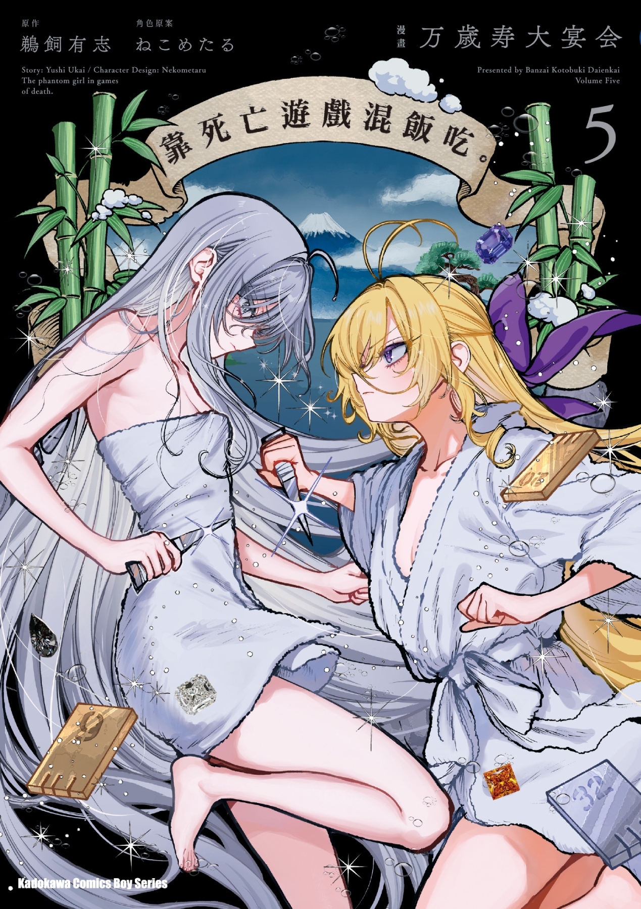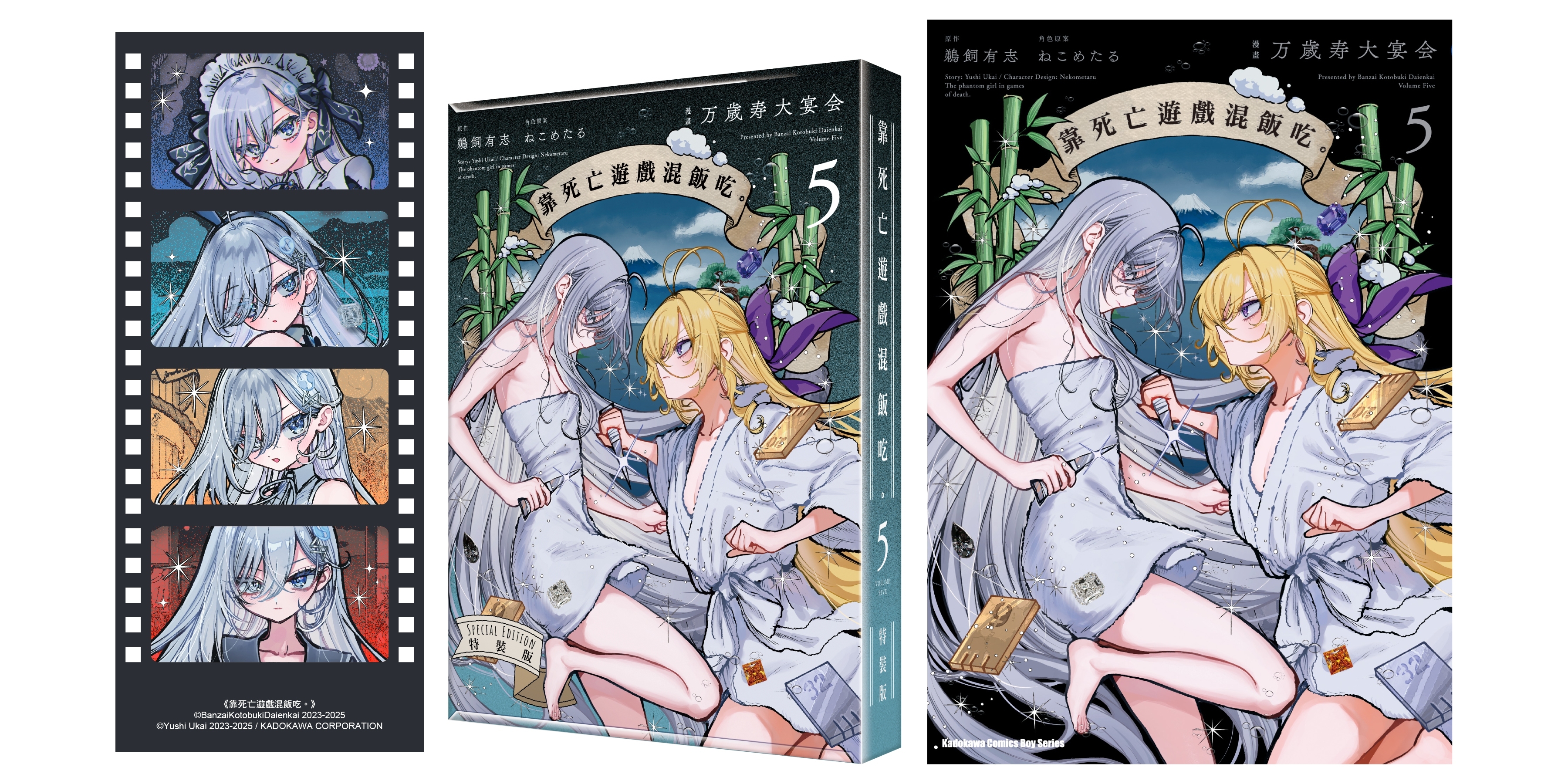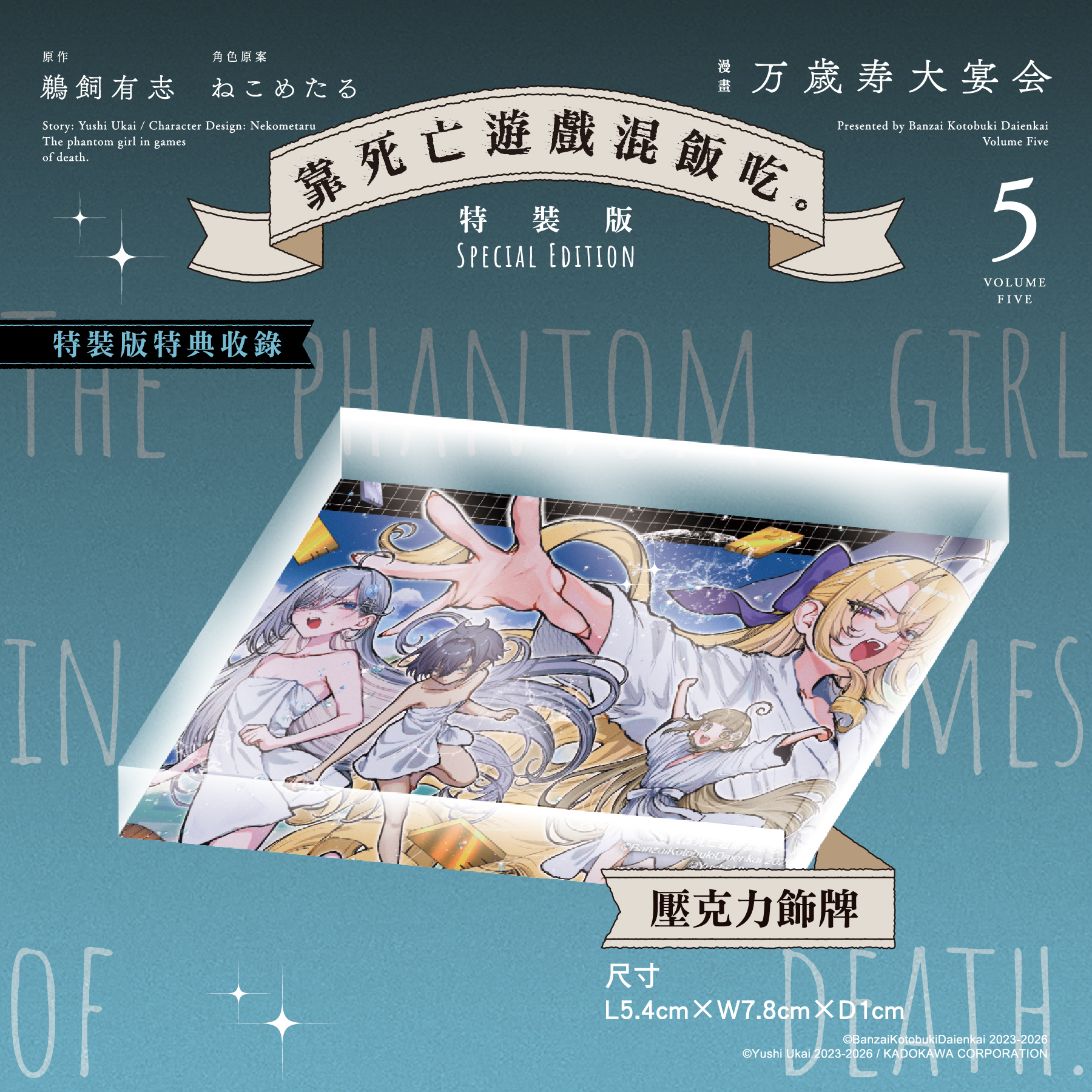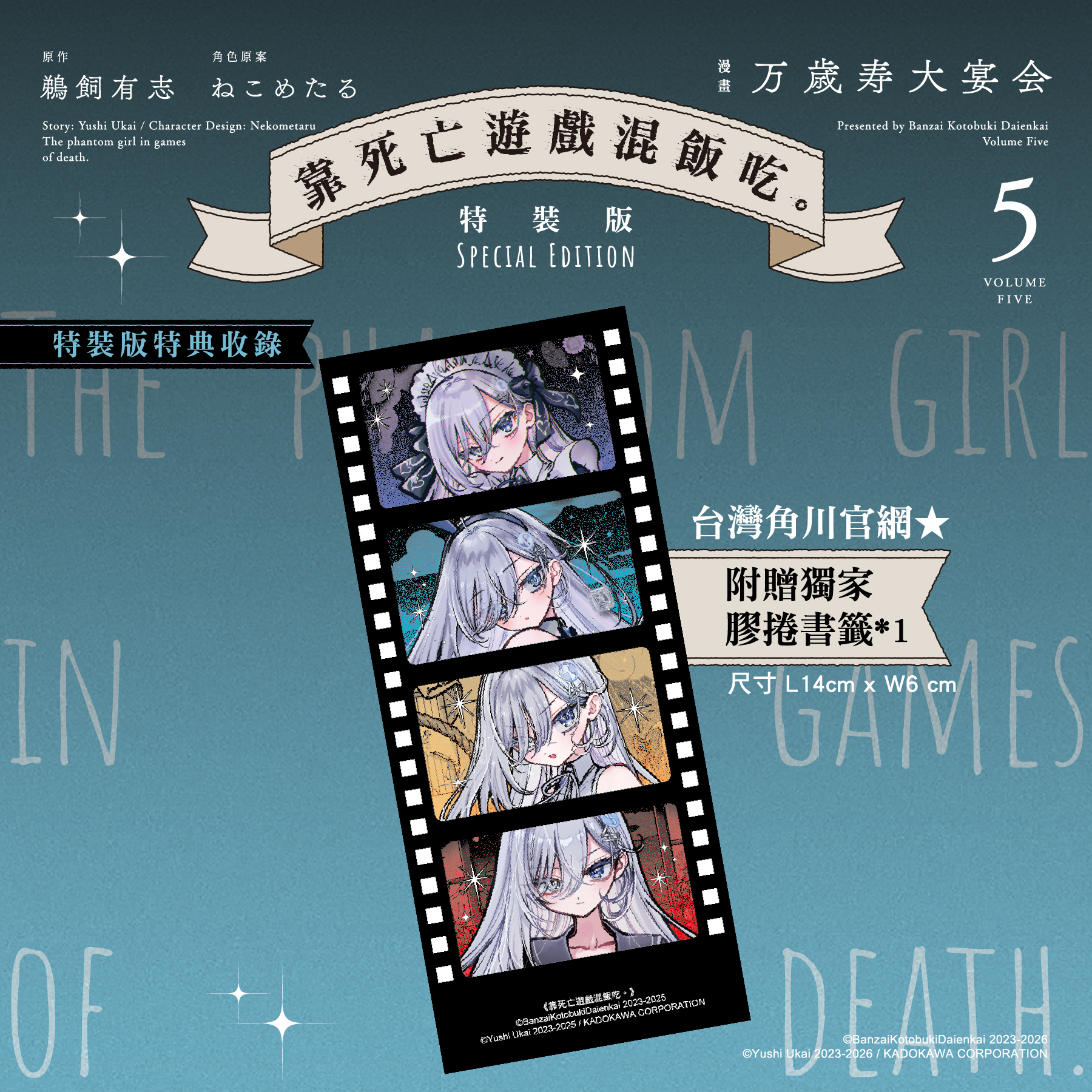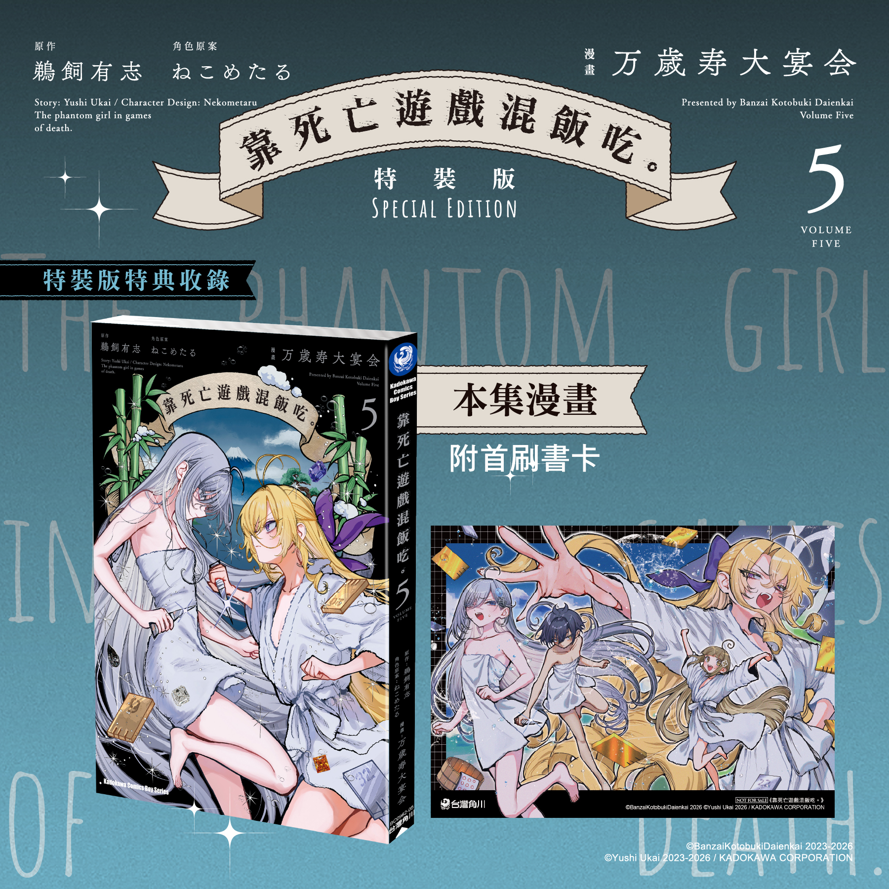 漫畫《靠死亡遊戲混飯吃 (5)》以宿敵重逢的經典劇情《GOLDEN BATH》幽鬼與御城大小姐的激烈浴池戰鬥場面為主題,規劃特裝版收錄多款特典:「壓克力飾牌」質感透亮壓克力材質展現角色層次,完美呈現精彩對決名場面、「幽鬼JK制服Ver.毛巾」以高品質親膚纖維搭配細緻印刷工法,身著女高中生制服的幽鬼絕美睡顏值得珍藏!特典與「本集漫畫with首刷小卡」皆收錄於「特裝版珍藏書盒」。自即日起於台灣角川官網及全台指定通路開放預購,期間至 5/7(四) 23:39 為止。凡於官網完成預購者,加碼贈送滿額優惠券100元(每會員限使用/領取乙次,使用期限為60天),另可額外獲得限定特典「官網獨家!膠捲書籤」乙份,書籤採用半透明 PET 材質,模擬電影膠捲的質感,極具電影感與藝術張力。有意者還請把握預購機會,以免向隅。