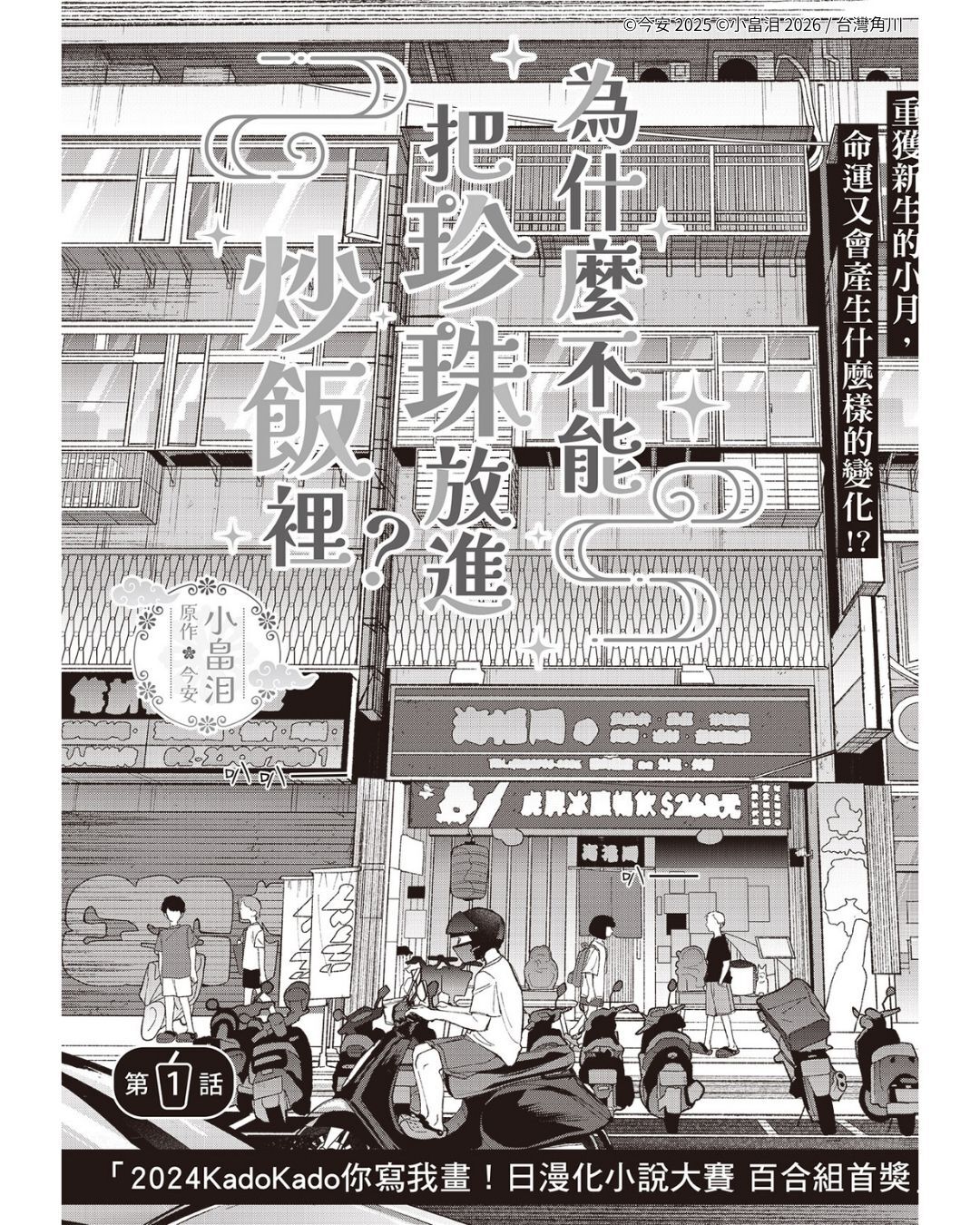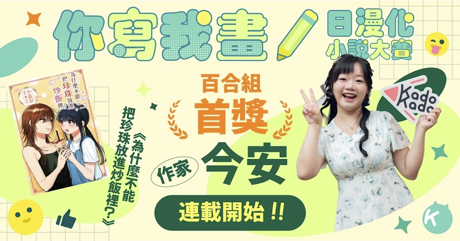 近年台灣角川致力於促進台日創作交流、激發原創故事潛力,由KADOKAWA、台灣角川和KadoKado角角者推出的「2024KadoKado你寫我畫!日漫化小說大賽」終於正式迎來漫畫化成果。榮獲百合組首獎的作品——今安老師的《為什麼不能把珍珠放進炒飯裡?》邀請日本漫畫家小畠泪負責作畫,透過跨國合作形式,將文字故事轉化為全新漫畫表現,並於2026年4月28日起正式開始連載,開啟台日合作的嶄新篇章。