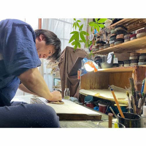 1975年 木版画摺師、鉄井孝之の次男として東京に生まれる。会社員を経て鉄井木版画工房に入り摺師の道へ。